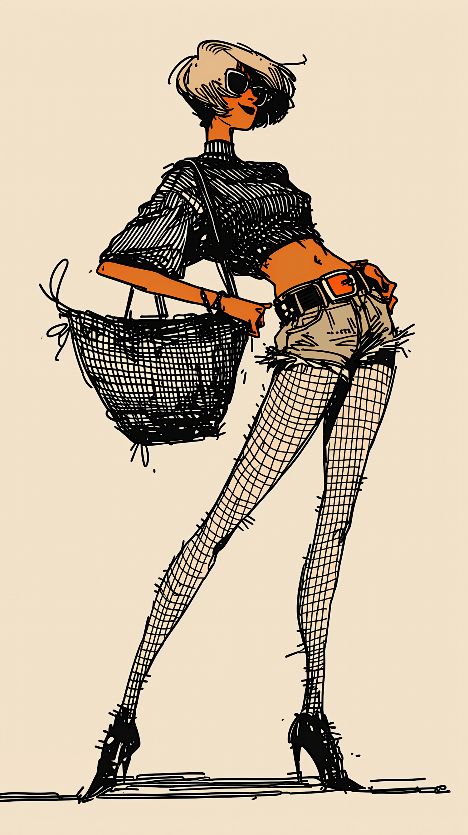 Stylized illustration of a fashionable figure in a chic outfit with bold lines and minimal background, showcasing modern style.