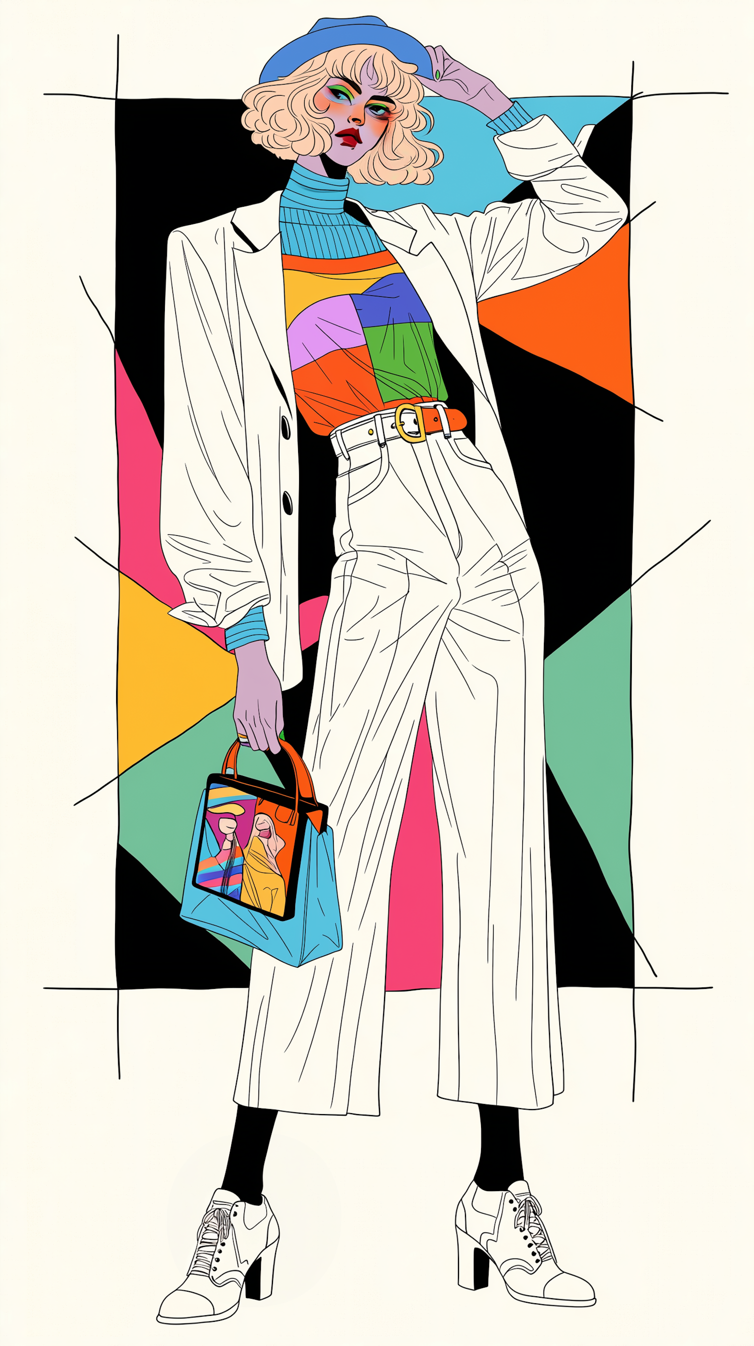 Stylish illustration of a person in a white suit with a colorful top, holding an artistic handbag, set against a bold geometric background.