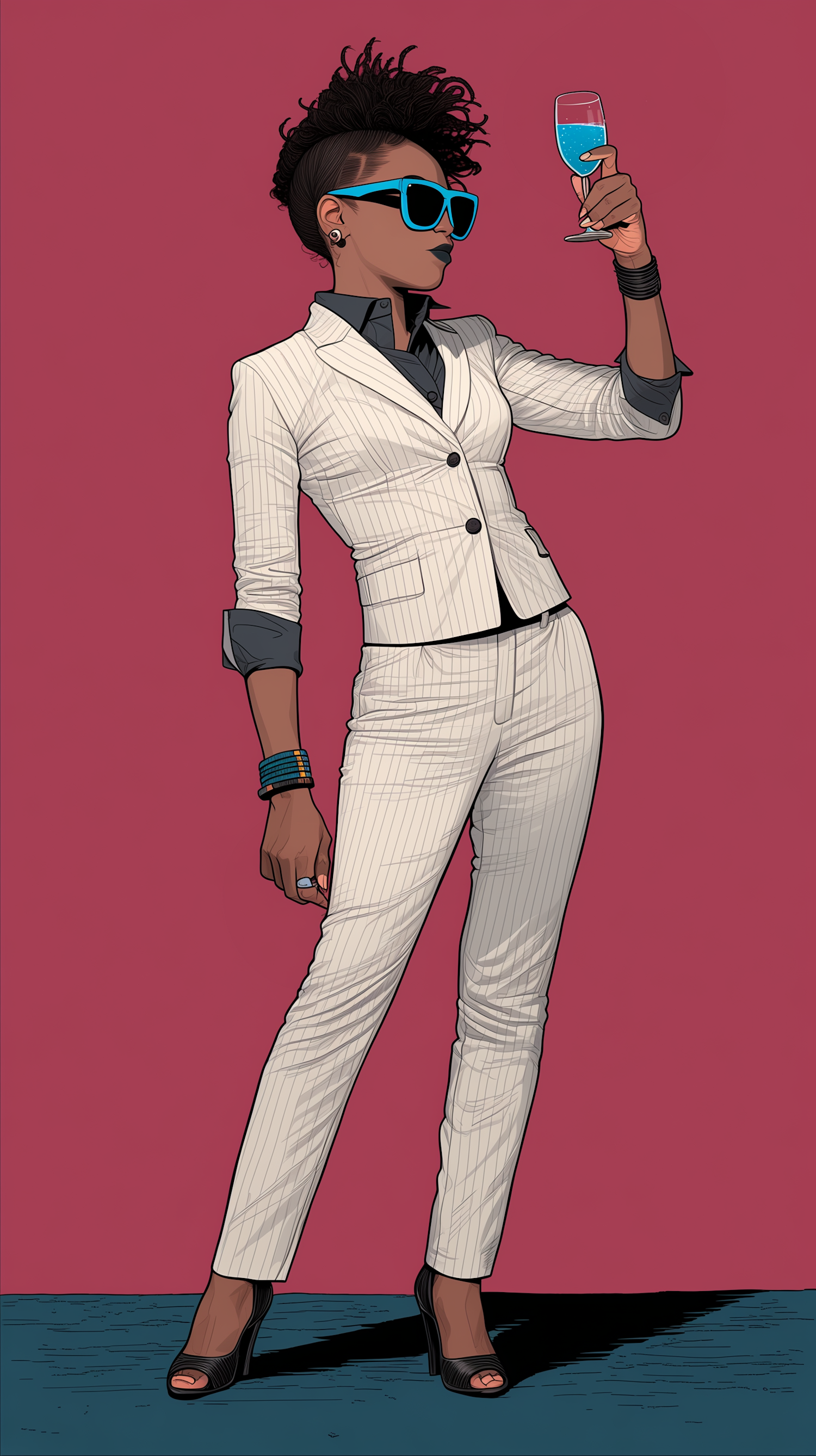 Stylish illustration of a person in a white pinstripe suit, blue sunglasses, and a mohawk, holding a glass of blue liquid against a pink background.