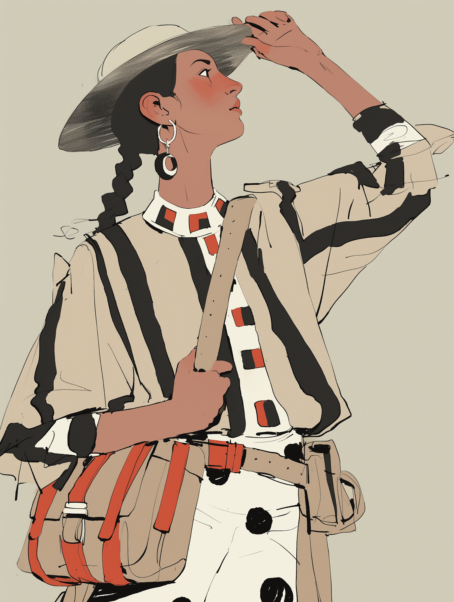 Stylish illustration of a woman in a hat and striped coat, with a geometric-patterned shirt and a chic shoulder bag.