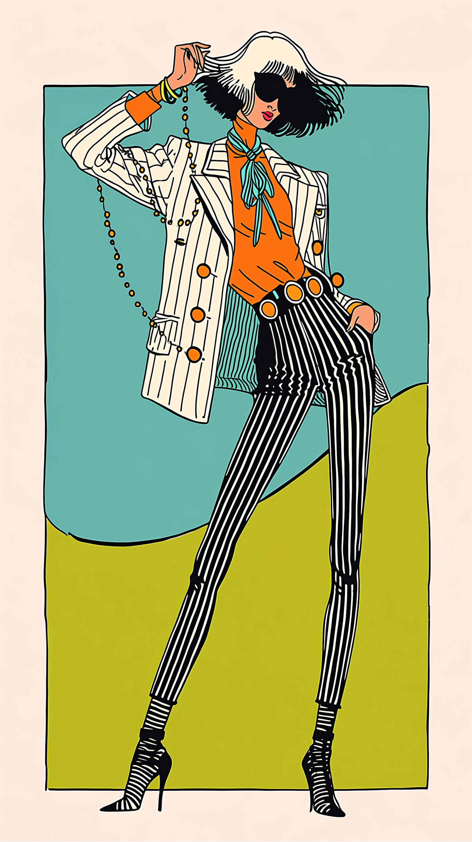 Stylized illustration of a fashionable figure in bold striped attire, accessorized with sunglasses and a beaded necklace, set against abstract shapes.