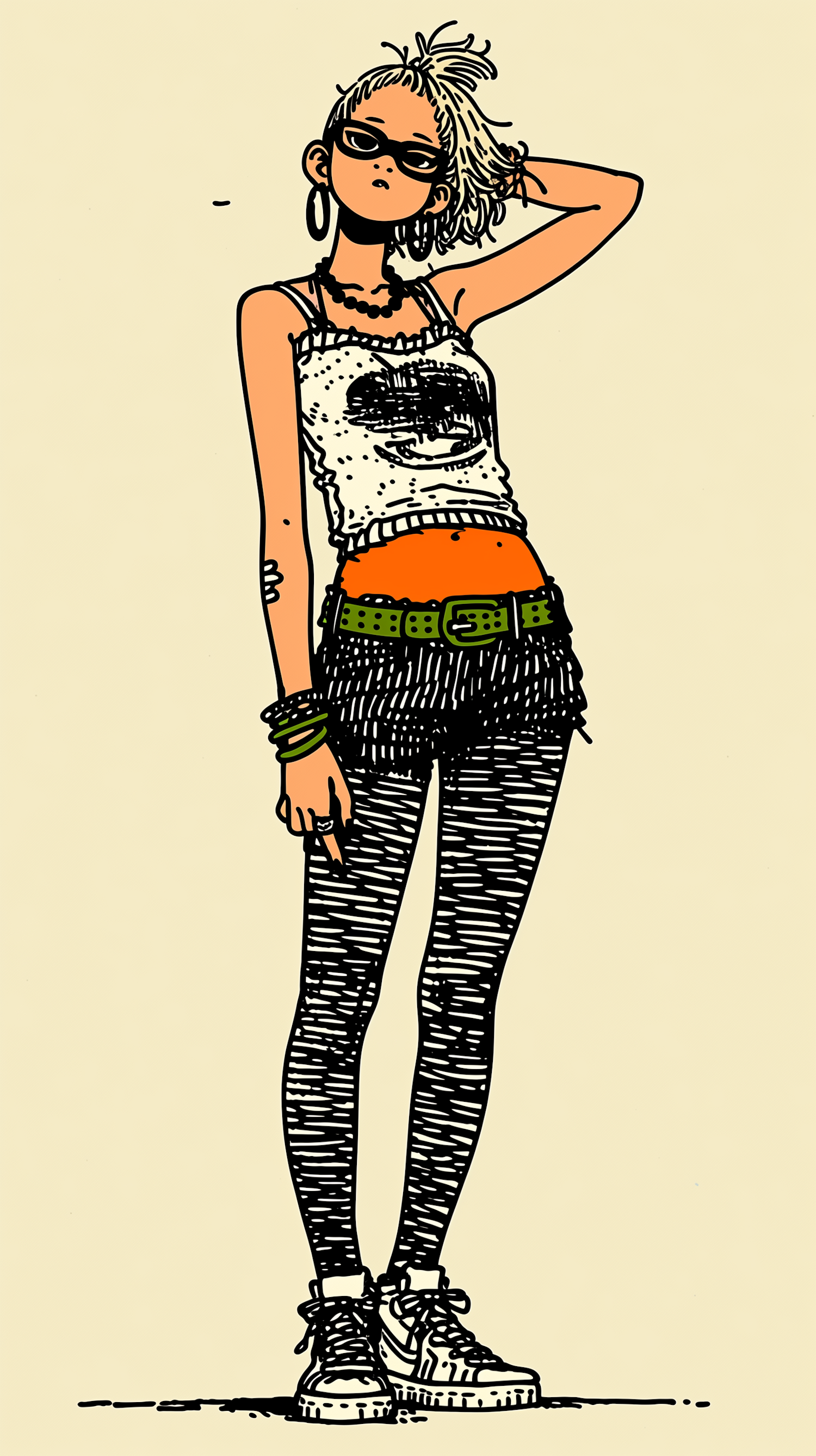 Stylized illustration of a trendy individual with bold fashion, featuring a tank top, striped leggings, and accessories.