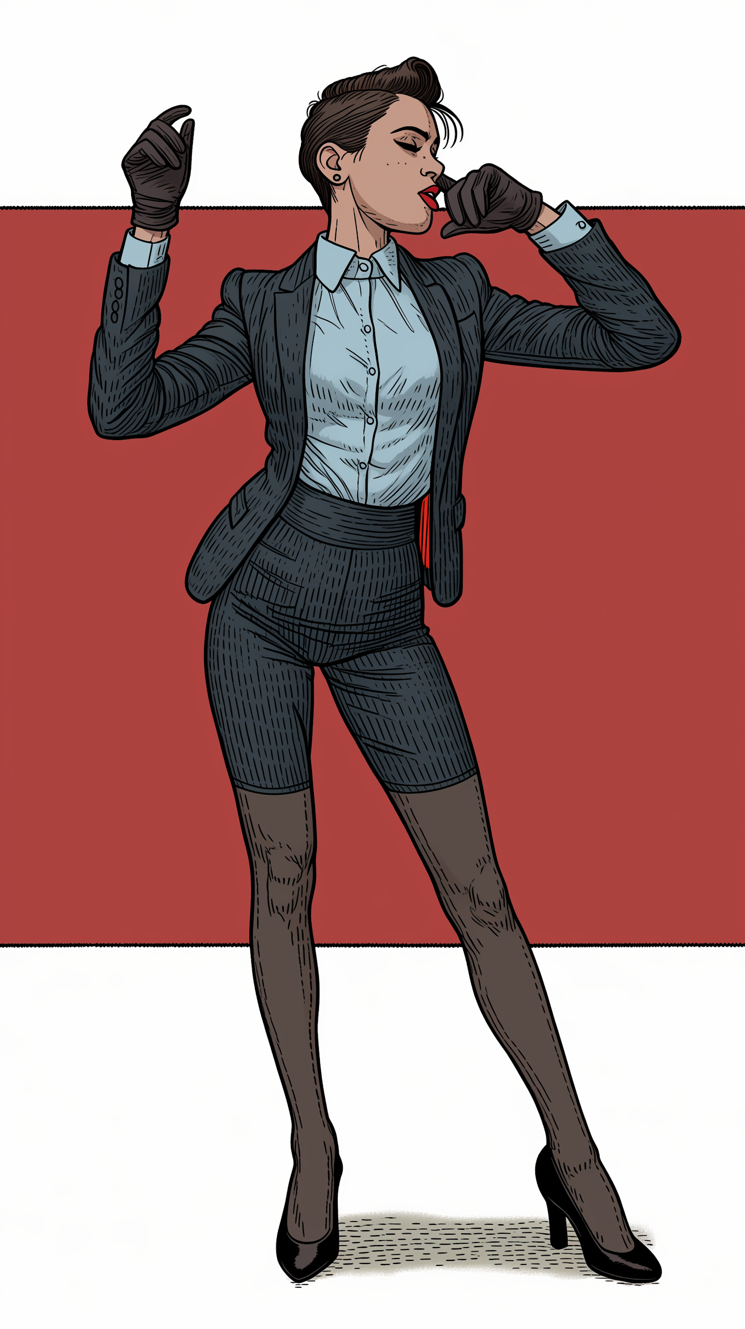 Stylish illustration of a person in a tailored suit and high heels, striking a confident pose against a bold red and white background.
