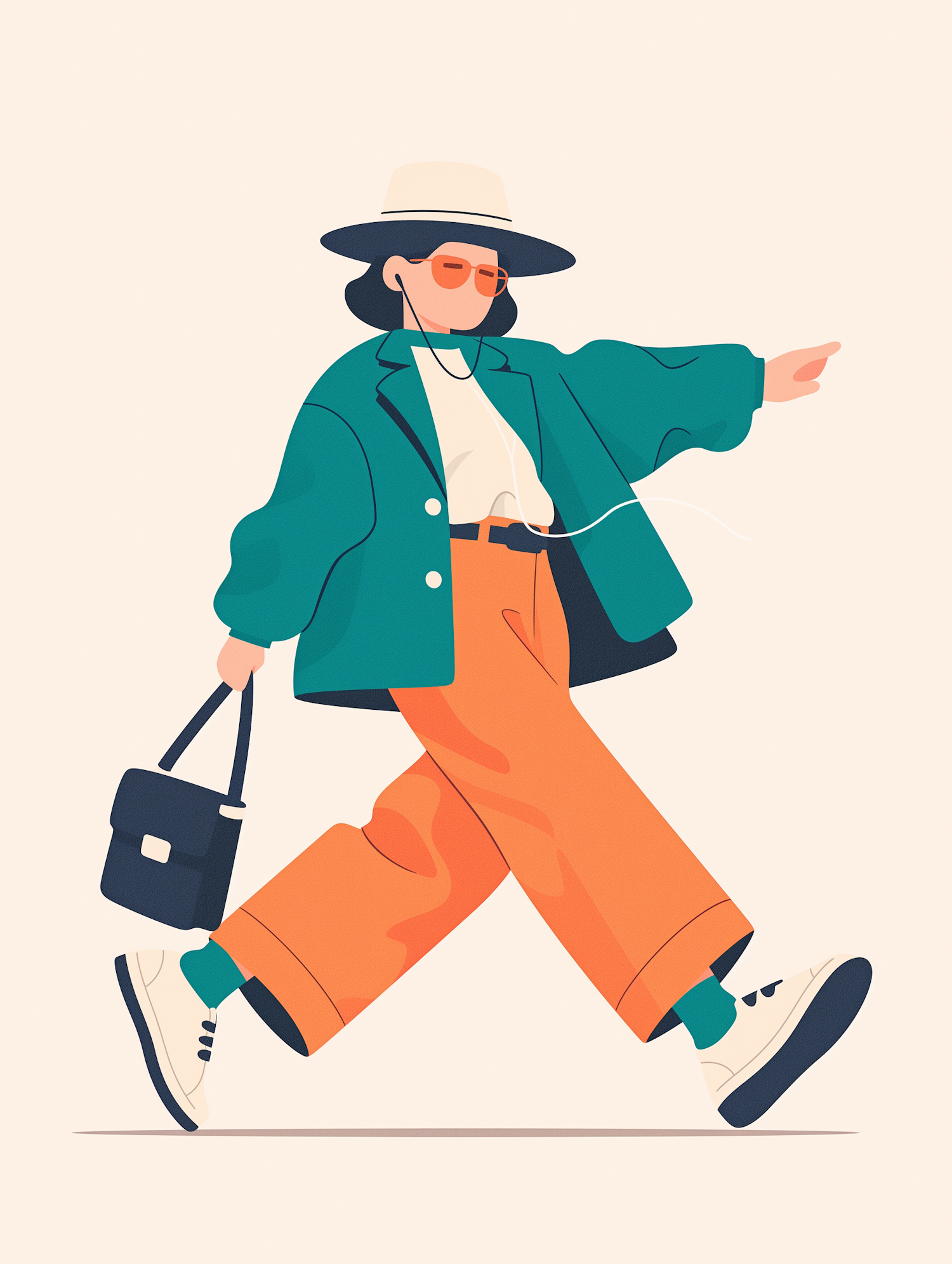 Stylish illustration of a person in a teal jacket and orange pants, walking with confidence and flair, wearing a hat and sunglasses.