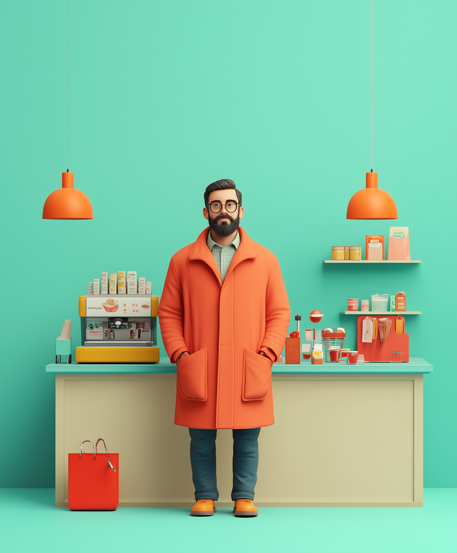 Stylized illustration of a bearded man in an orange coat at a vibrant teal and orange-themed counter.