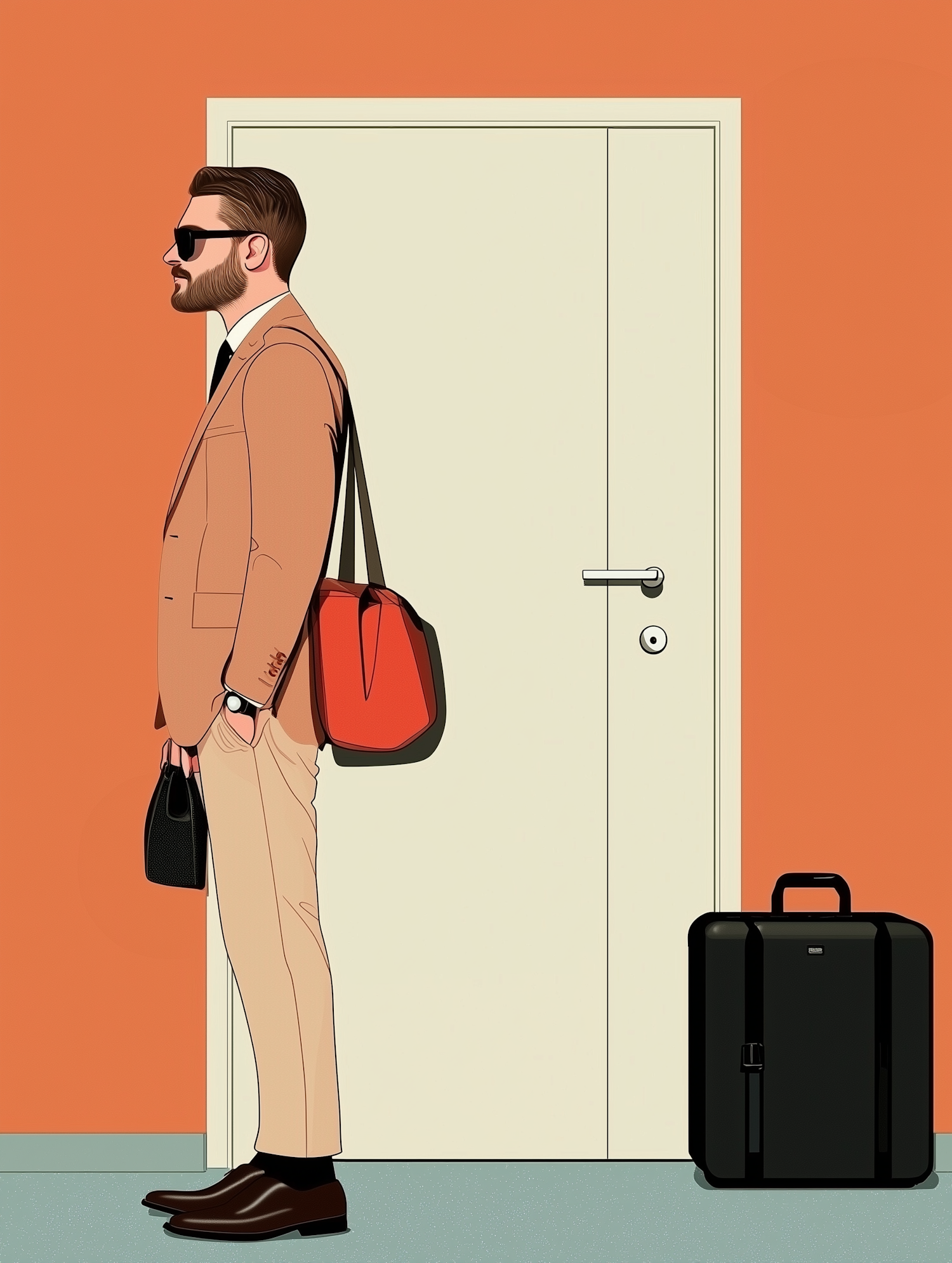 Stylish man in a brown suit with sunglasses, holding a briefcase and suitcase, against an orange wall and white door.