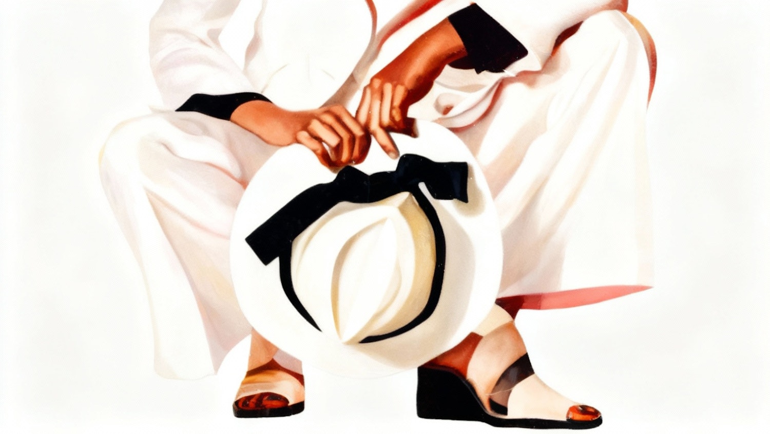 Stylish composition of a person holding a white hat with a black ribbon, dressed in white with black accents, and wearing wedge sandals.