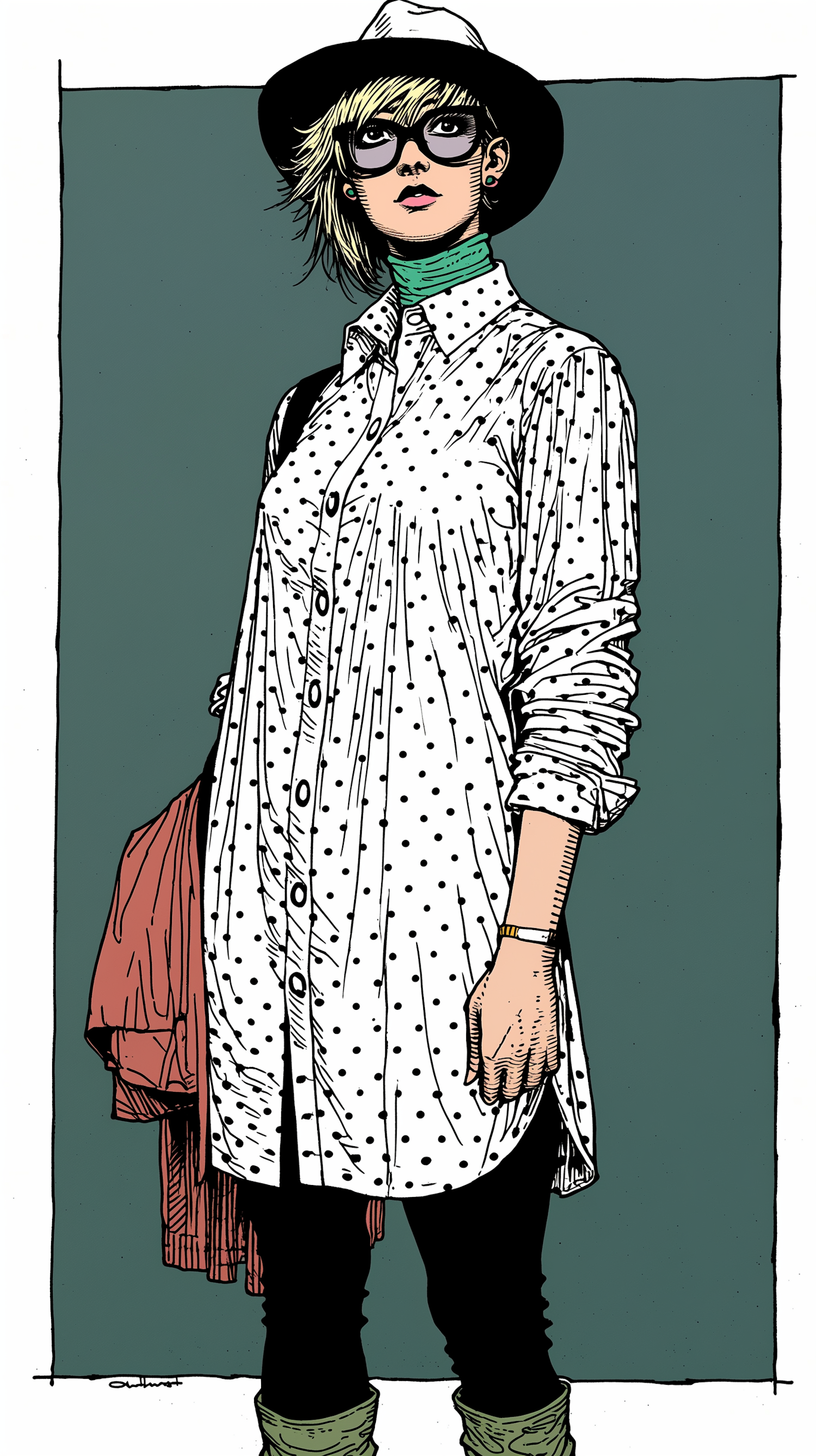 Illustration of a fashionable person in a polka-dotted shirt, black hat, and glasses, exuding a modern and artistic vibe.