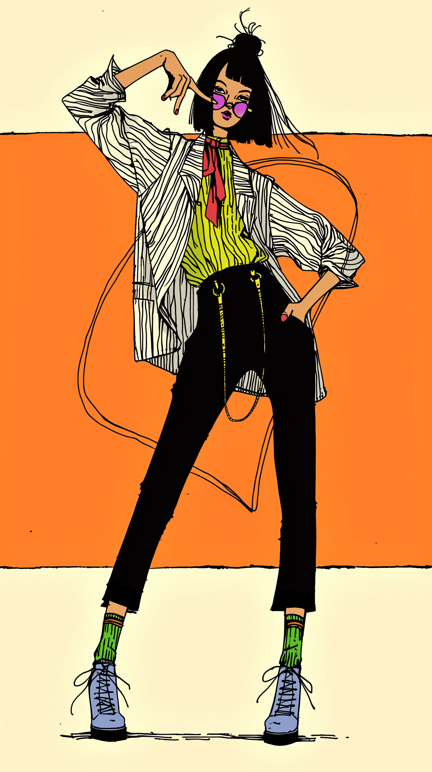 Stylized illustration of a trendy individual in bold fashion, featuring vibrant colors and a striking pose against an orange backdrop.