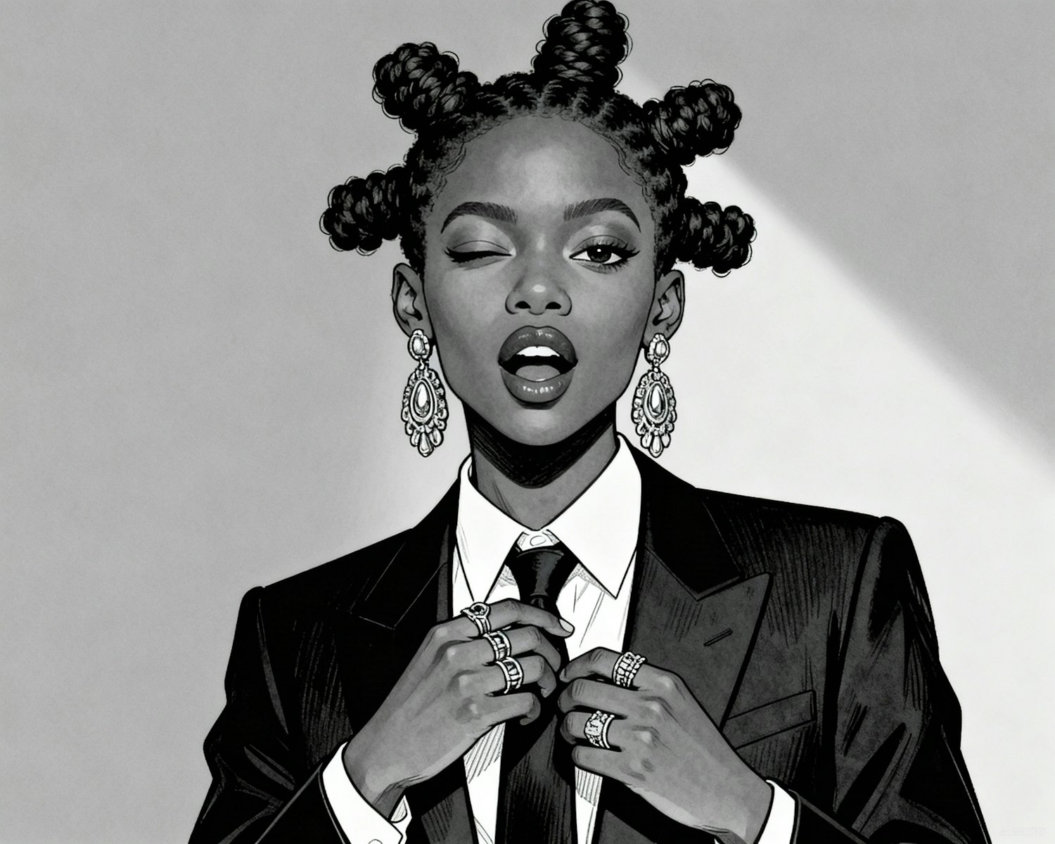 Stylish monochrome illustration of a person in a suit with bantu knots, ornate earrings, and rings, exuding confidence and flair.