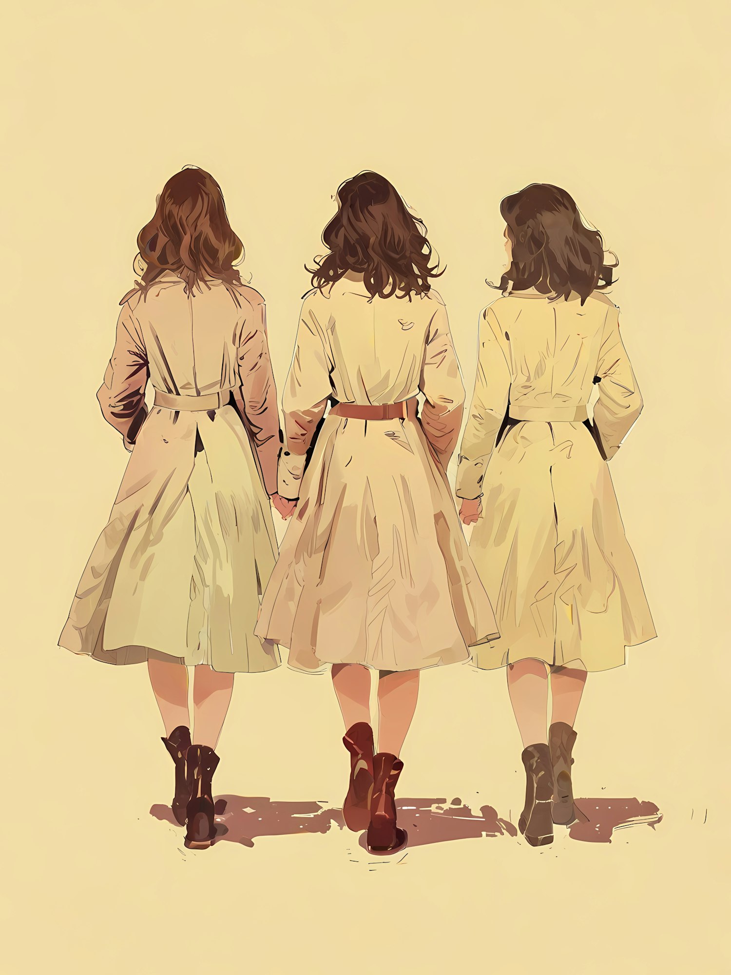 Three individuals in beige trench coats walk away in unison against a minimalist beige backdrop, evoking simplicity and motion.