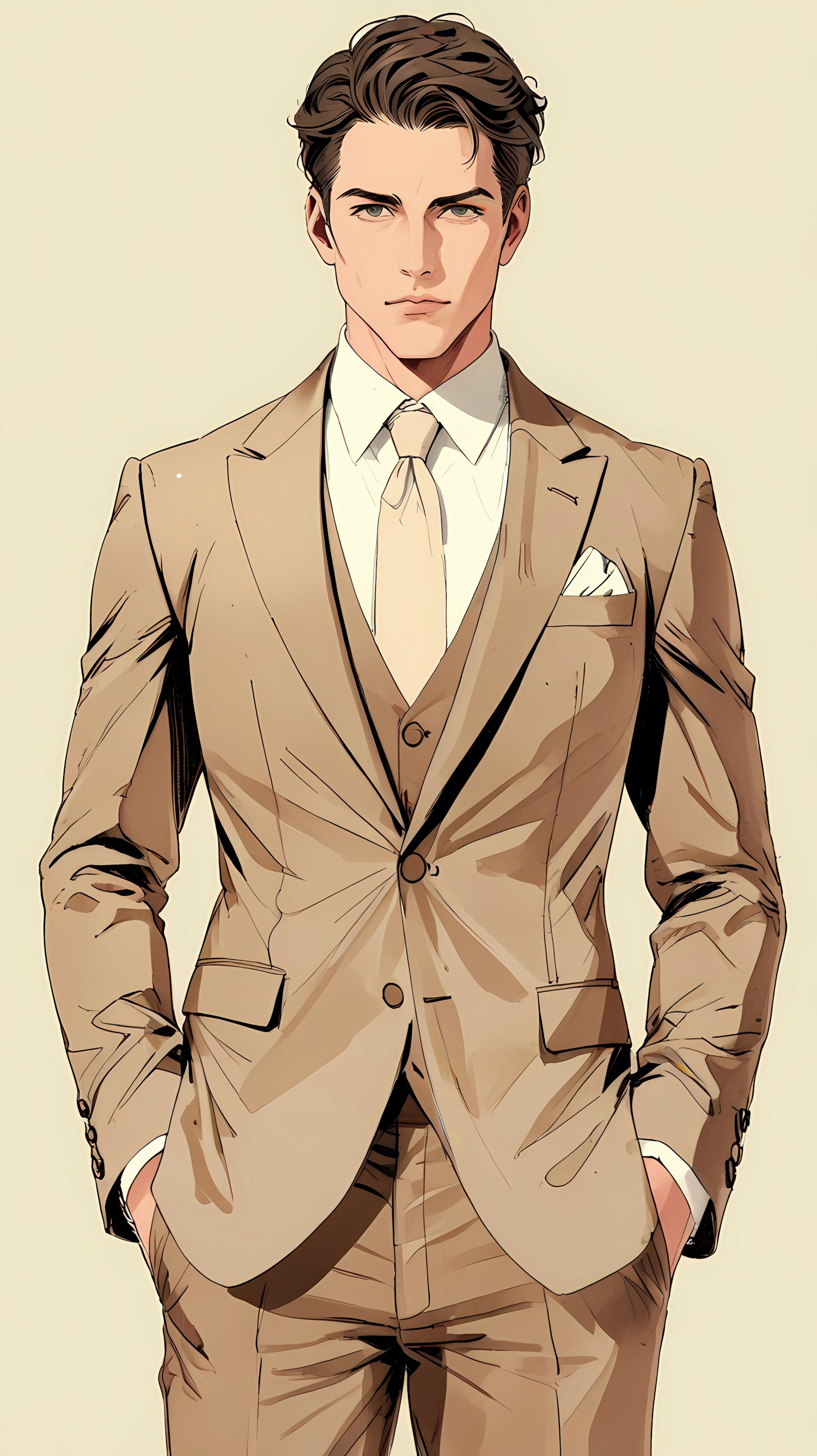 A stylish and sharp digital illustration of a person in a tan three-piece suit with a beige tie, rendered against a neutral background.