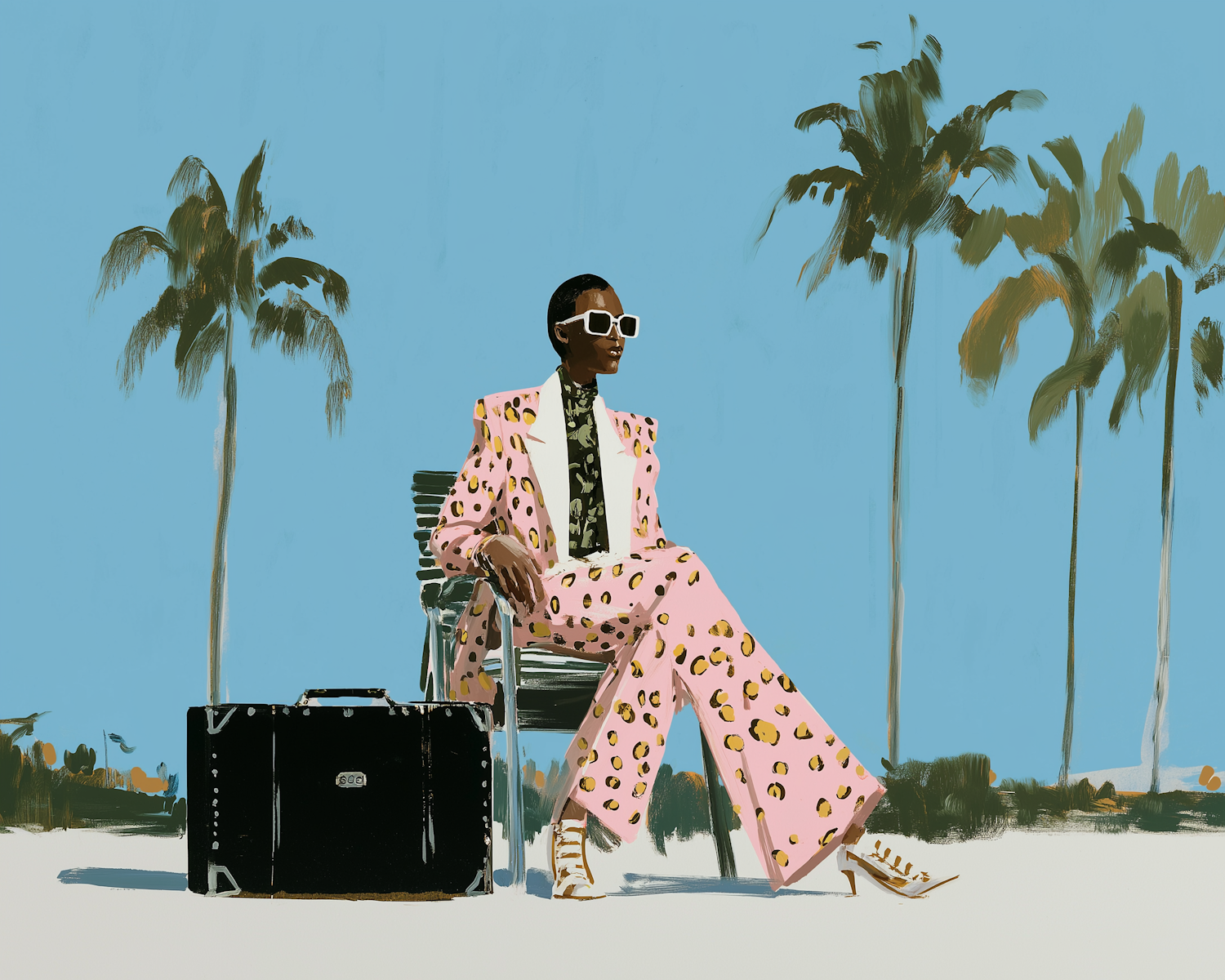 A fashionable person in a pink leopard-print suit sits by palm trees with a black suitcase, under a clear blue sky.