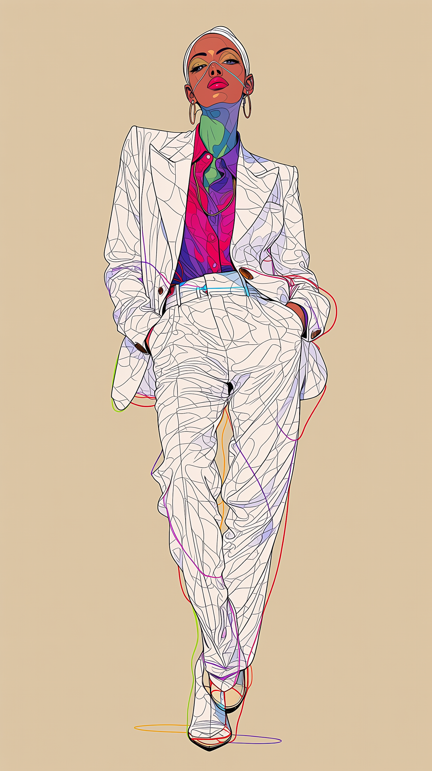 Stylish illustration of a person in a white suit with colorful accents, set against a beige background, exuding modern artistic vibes.