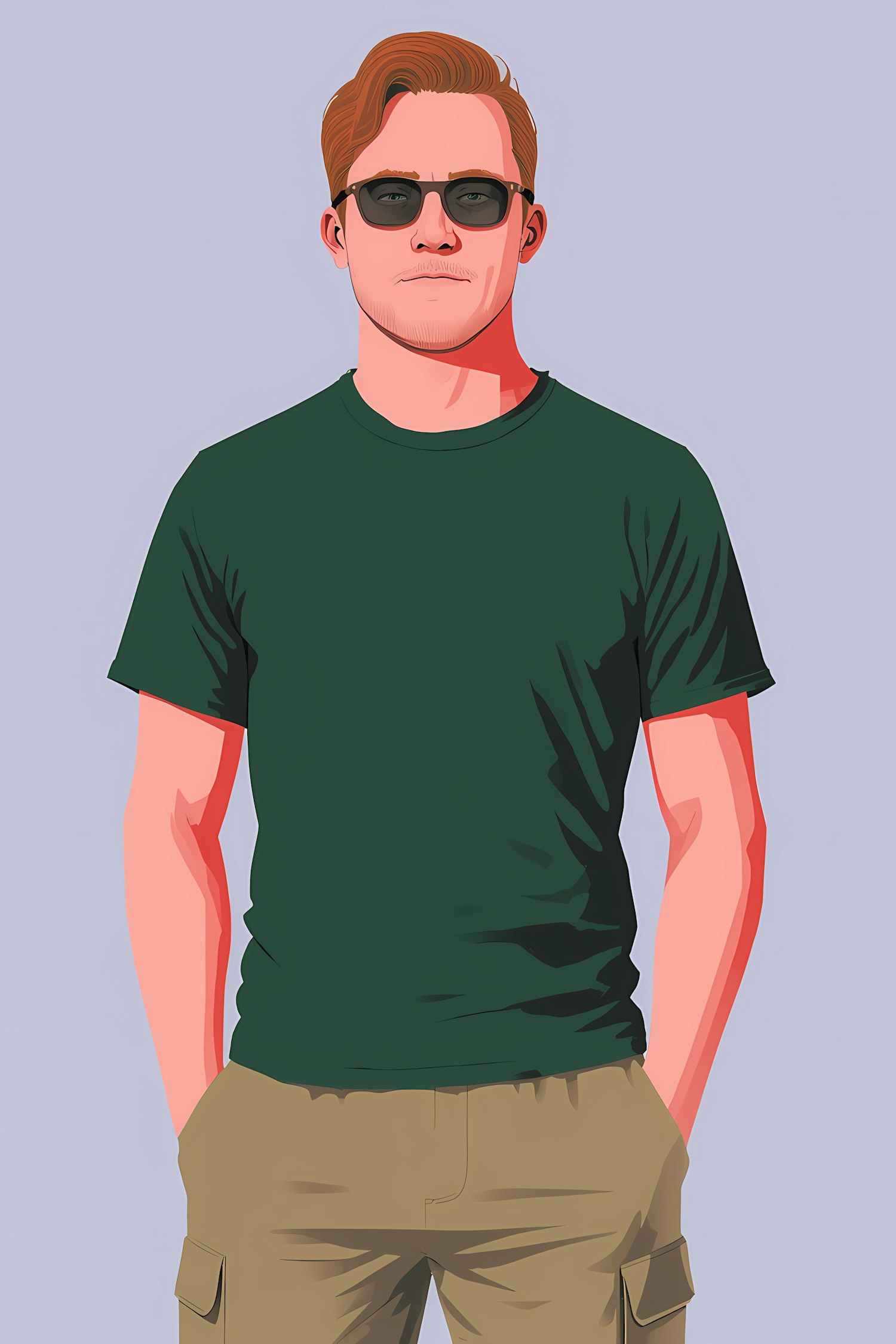 Stylized illustration of a man in a green shirt and beige pants, wearing sunglasses, set against a light purple background.