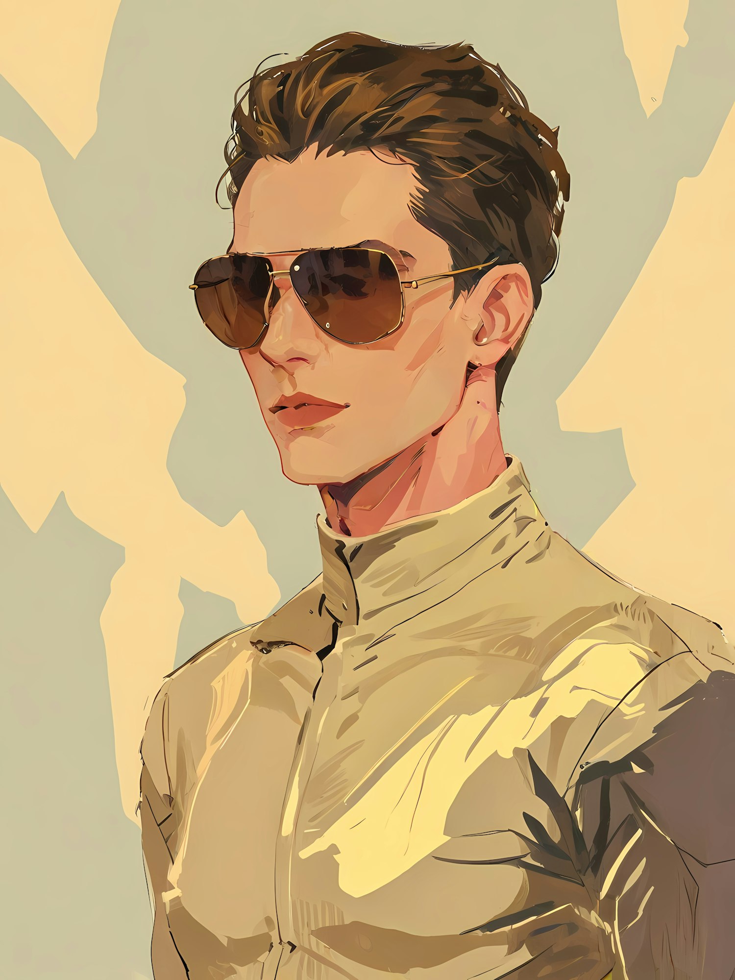 Stylish illustration of a person in aviator sunglasses wearing a light beige coat, set against a minimalist pale background.