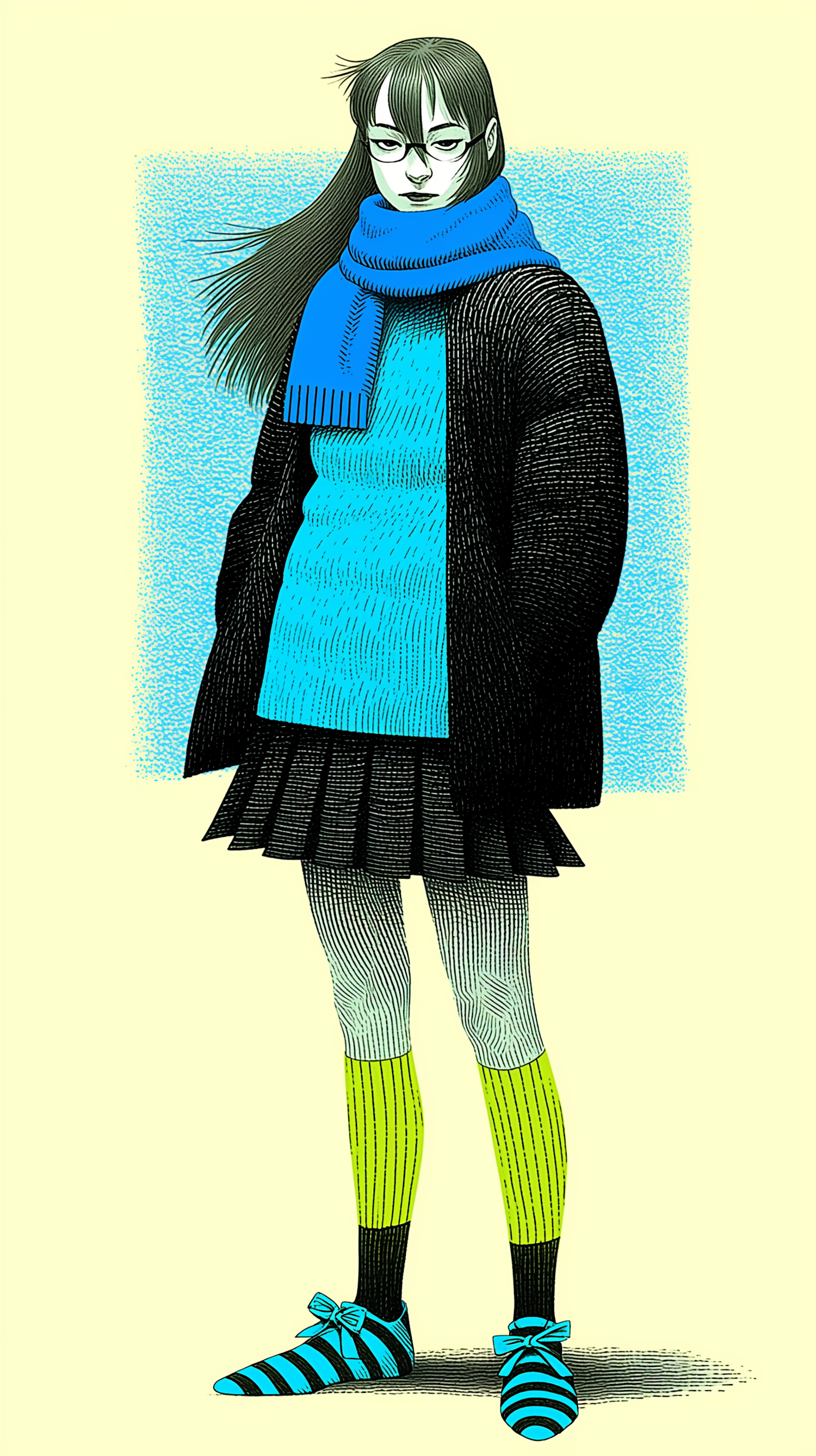 Stylish illustration of a person in a blue scarf and striped socks, showcasing a unique and vibrant artistic style.