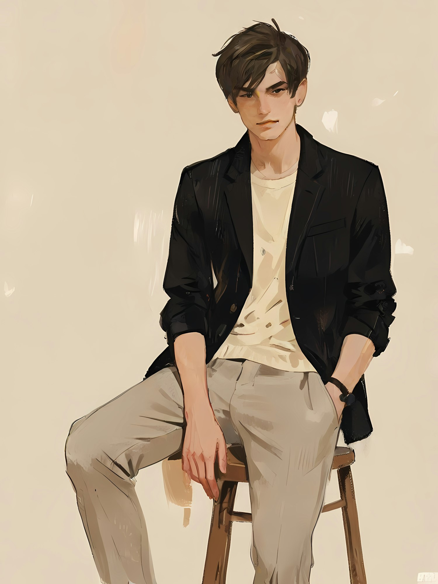 An illustrated young man sitting on a stool in a relaxed pose, wearing a black blazer and beige trousers against a beige background.