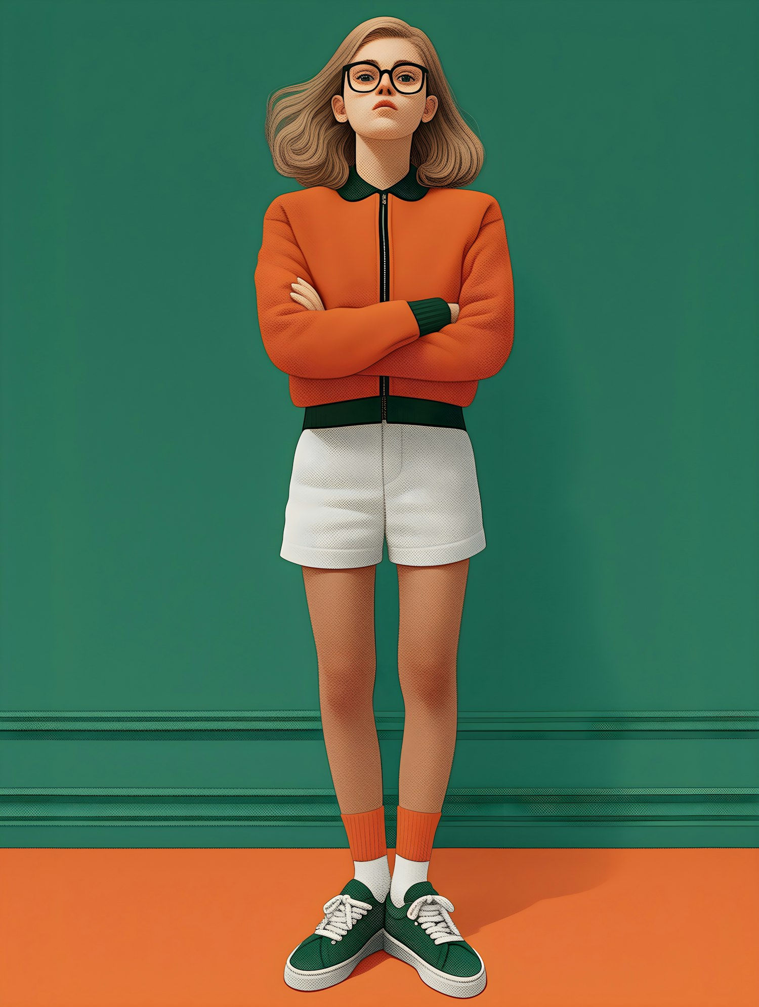 Trendy individual in orange and green attire standing confidently against a teal background, showcasing a modern minimalistic style.