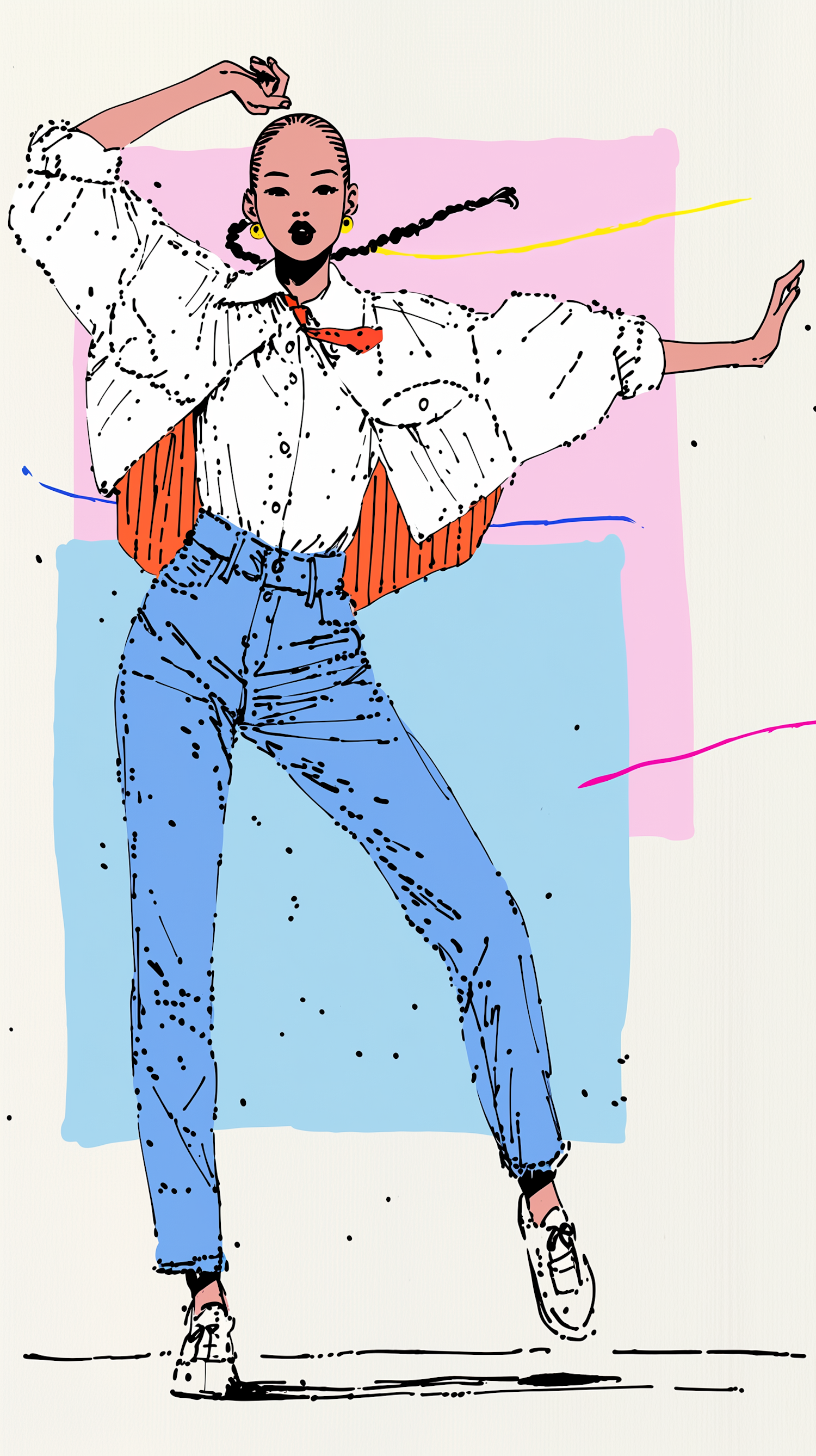 Stylish illustration of a person in a white shirt and blue jeans, set against a colorful abstract background.