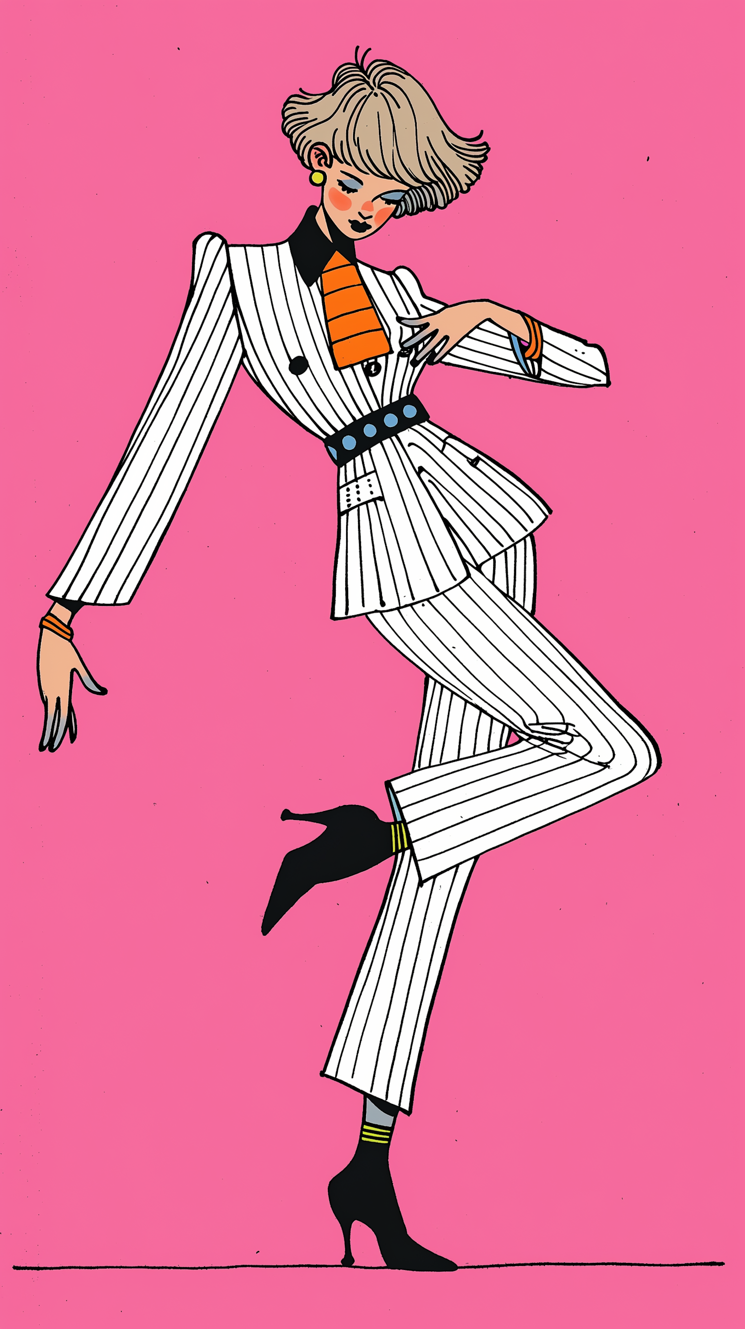 Stylish illustration of a person in a white pinstripe suit with an orange tie, set against a pink background, striking a dynamic pose.