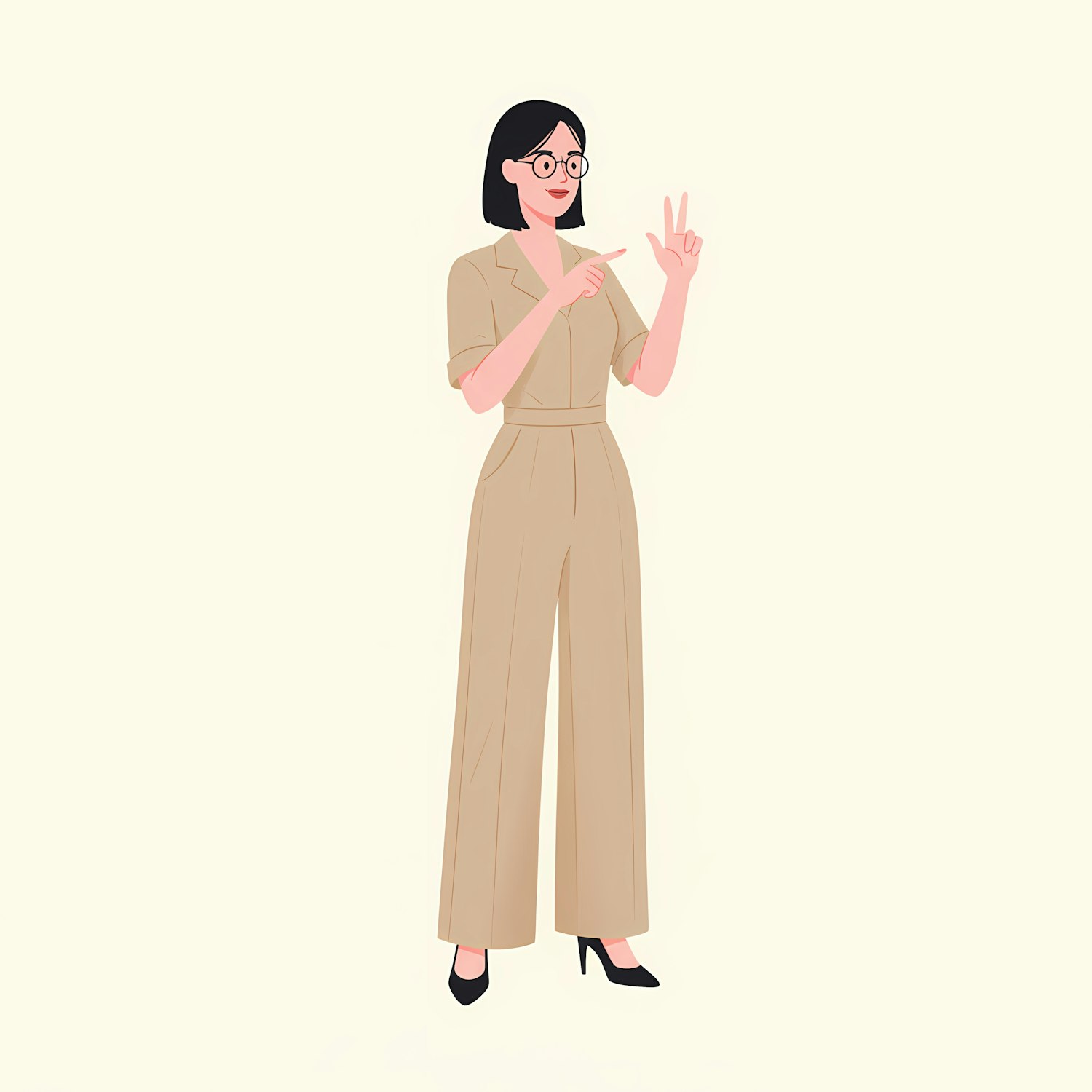 Illustration of a woman in a beige jumpsuit gesturing with her hands, set against a light background. Minimalistic and professional design.