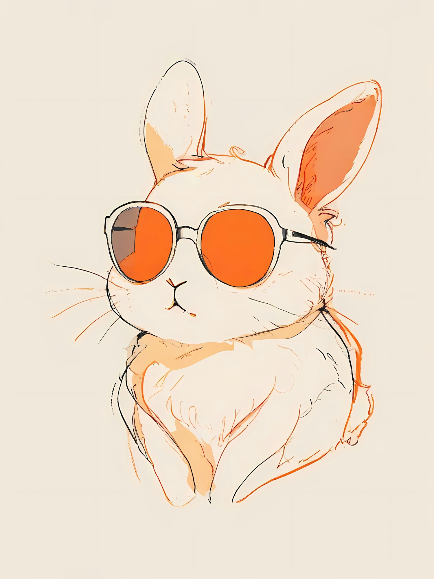 Illustration of a cute rabbit wearing orange-tinted sunglasses, with soft fur and a playful expression on a light beige background.