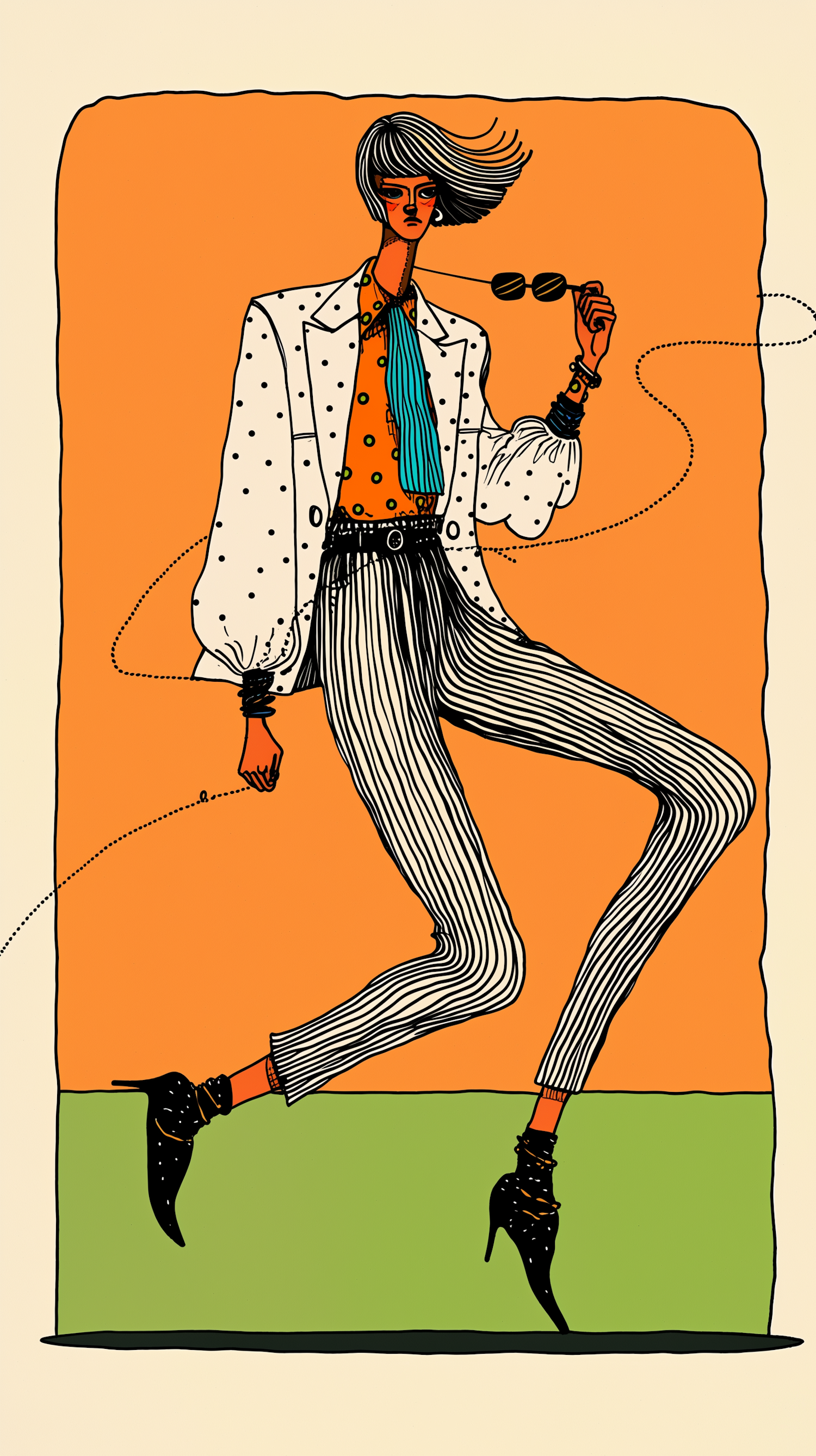 Stylized illustration of a fashionable figure in bold attire, featuring a polka-dotted jacket, striped pants, and vibrant colors.