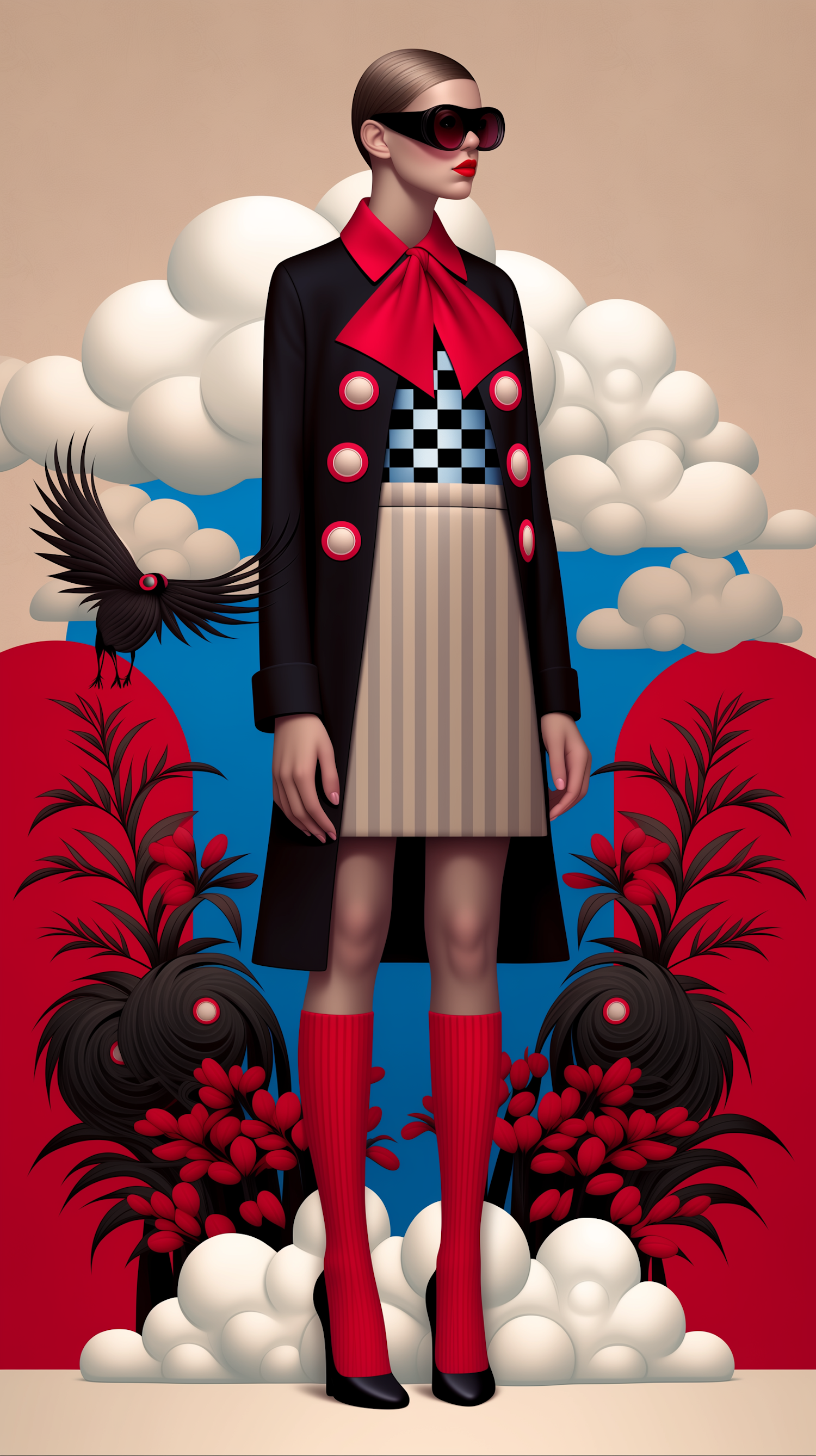 Stylized fashion illustration with bold colors, featuring a chic outfit and surreal background elements like clouds and abstract foliage.