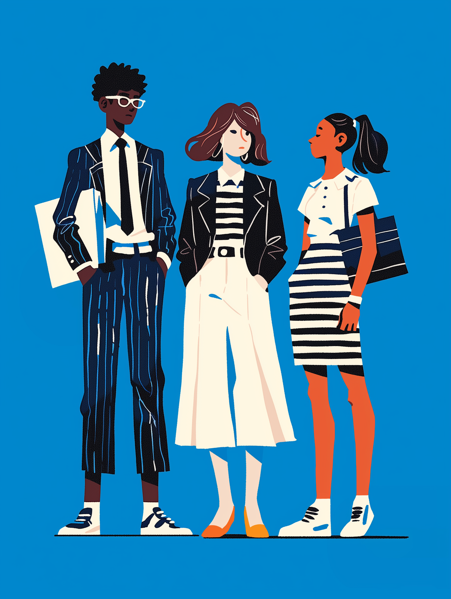 Stylish trio in modern outfits: pinstriped suit, striped shirt, and skirt against a vibrant blue background. Fashionable and confident.