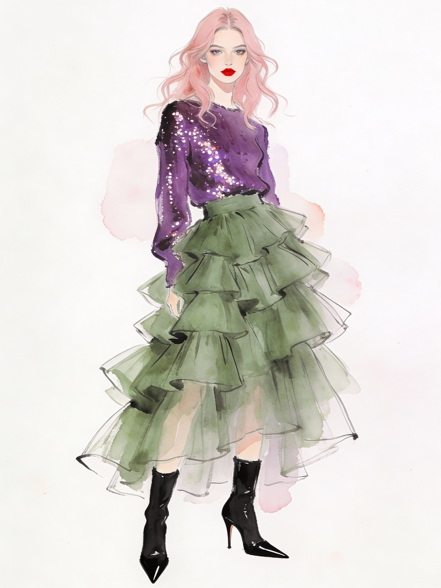 An abstract and minimal ink sketch of a fashion model with pale pink hair and red lips, with a Purple sequin top and sage green tiered ruffle tulle skirt, black stiletto pointed-toe boots