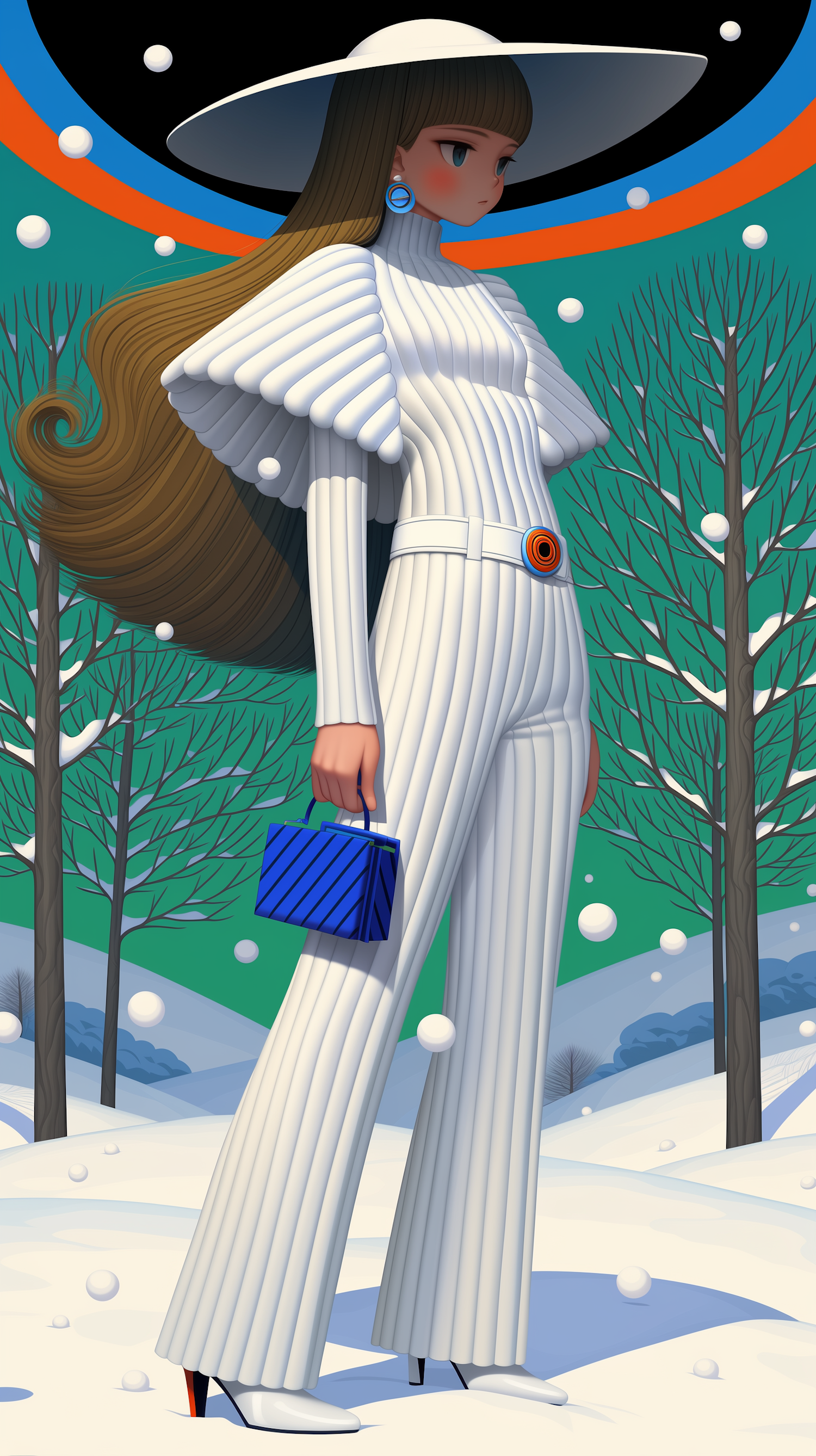 Stylized illustration of a fashionable woman in a snowy landscape, wearing a white outfit and holding a blue handbag, with a vibrant abstract background.