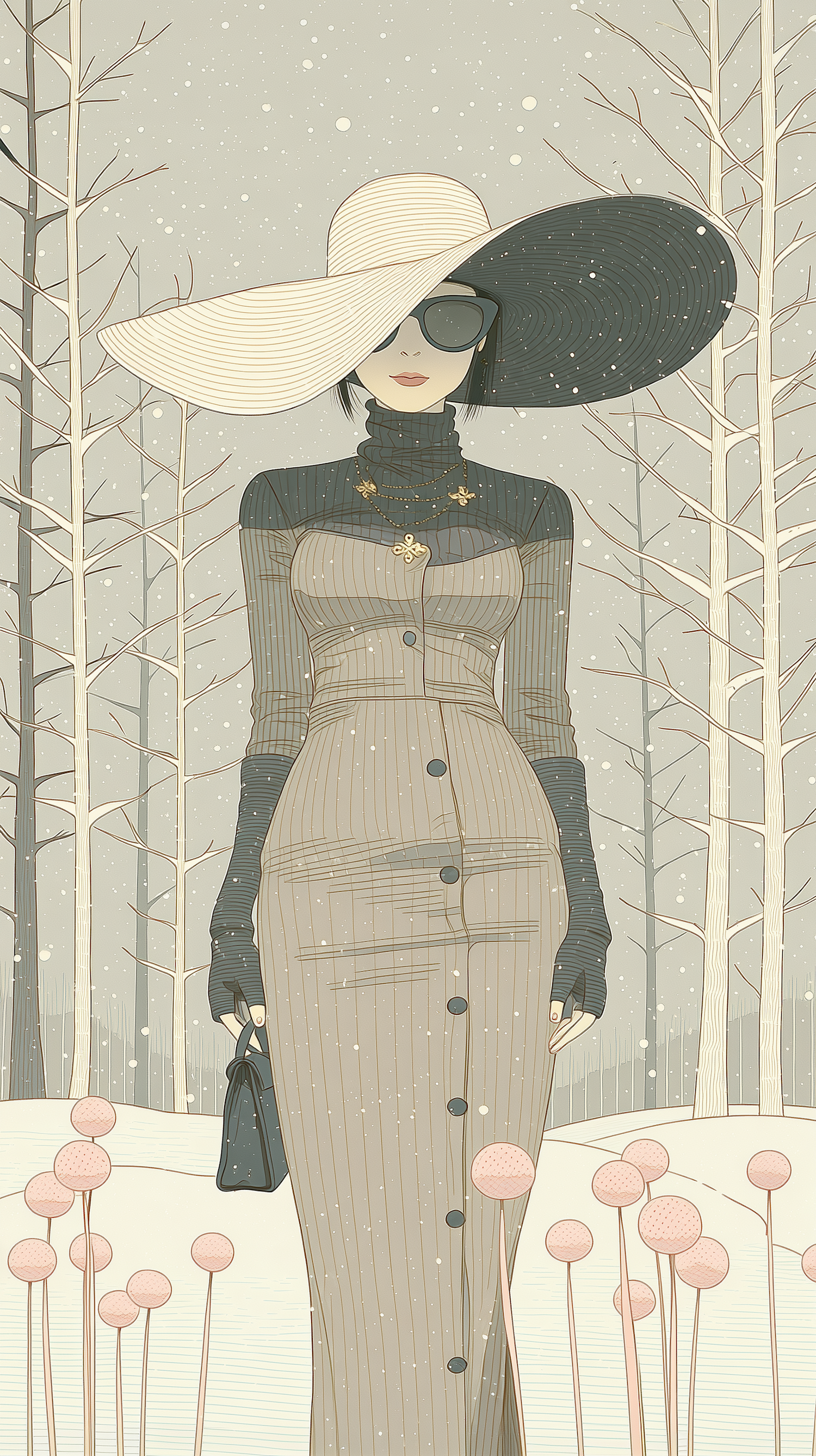 Stylized illustration of a fashionable woman in a snowy forest, wearing a wide-brimmed hat and a chic dress, surrounded by pink flowers.