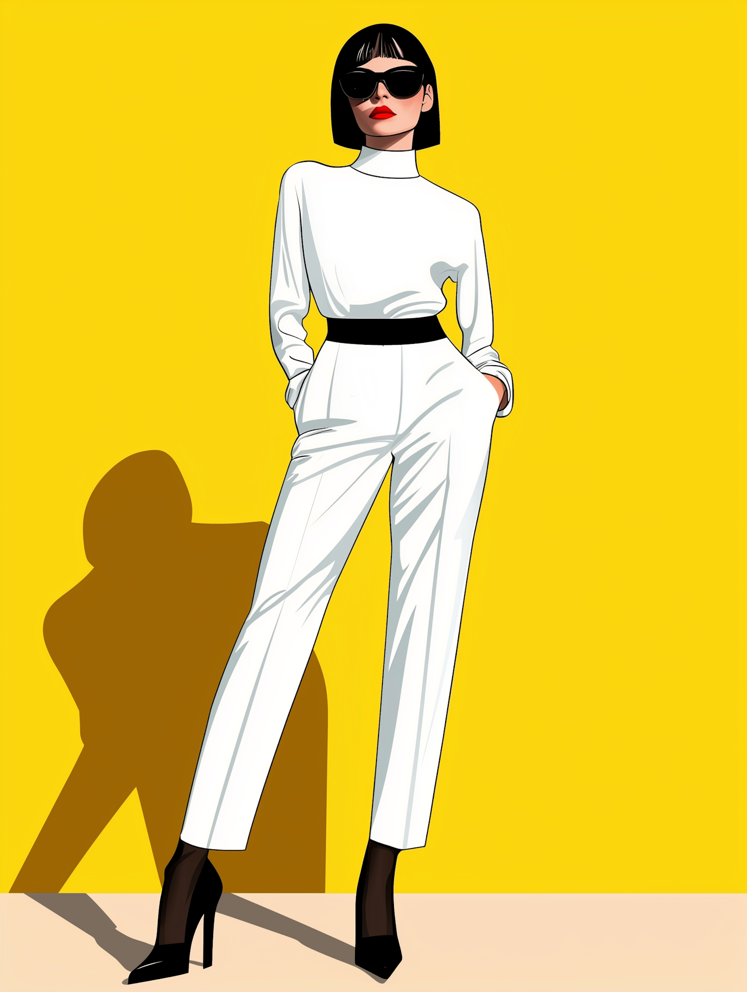 Chic woman in white jumpsuit and sunglasses against a vibrant yellow background, exuding modern elegance and style.