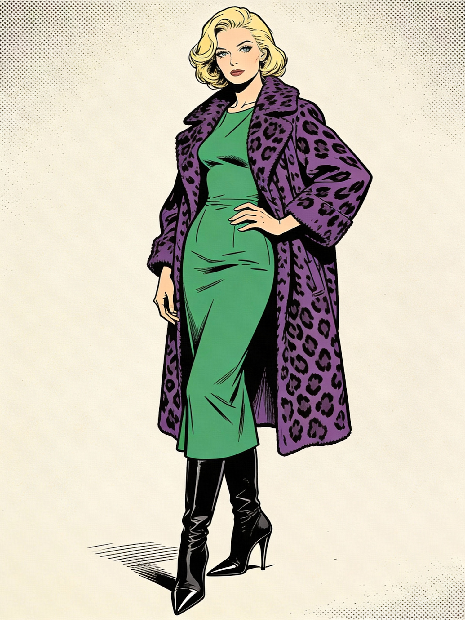 Stylish illustration of a woman in a green dress, purple leopard-print coat, and black boots, set against a minimal beige background.