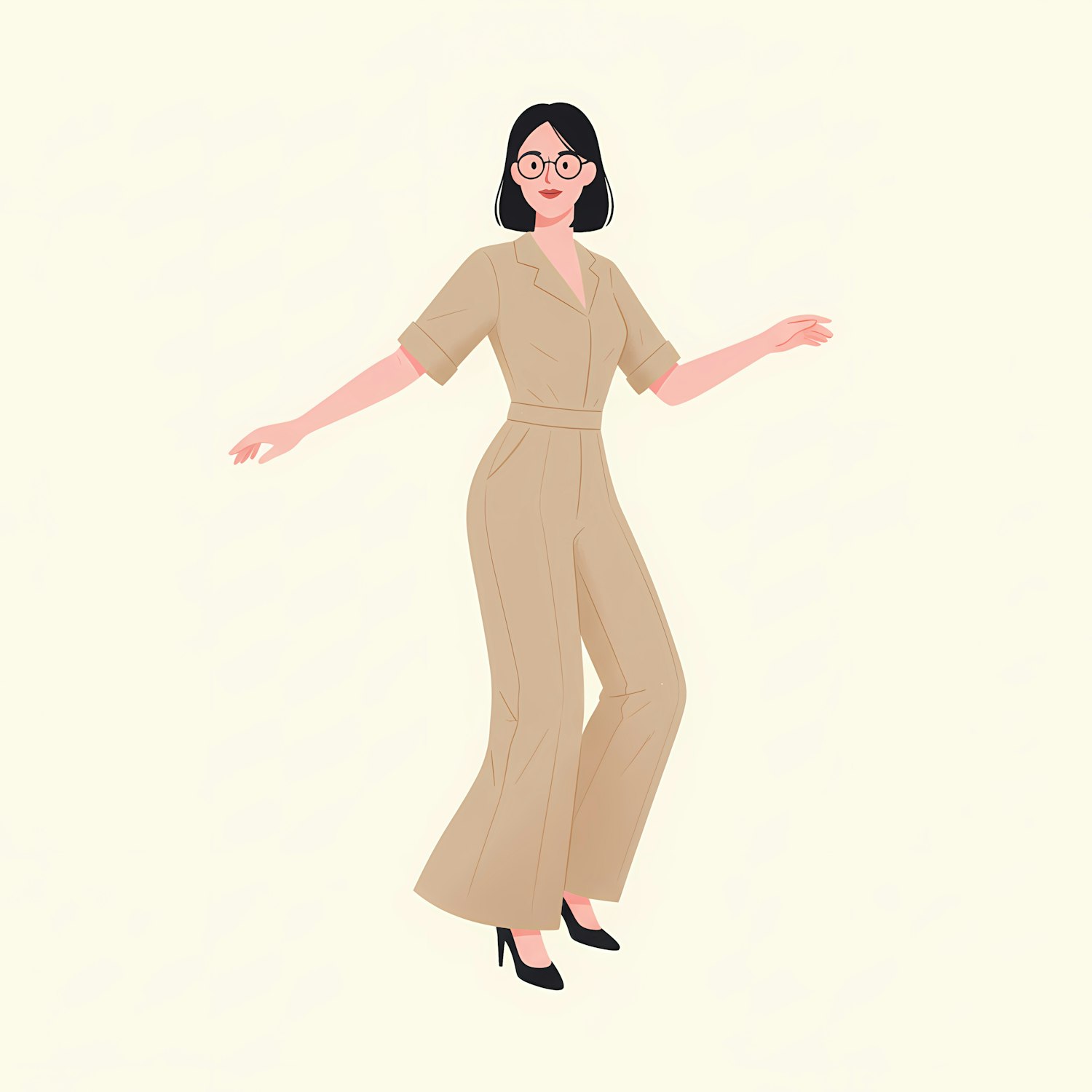 Stylish illustration of a woman in a beige jumpsuit and glasses, standing gracefully against a light background.