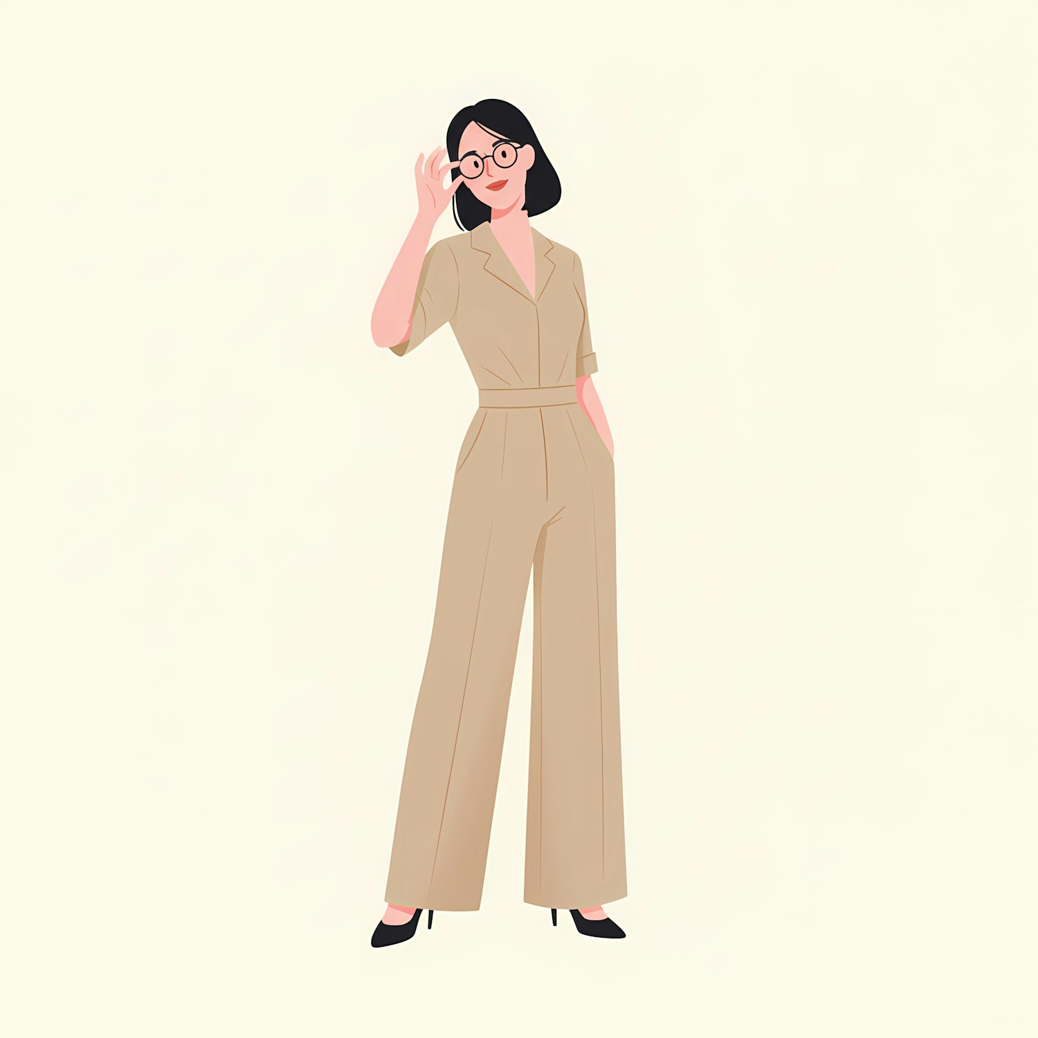 Illustration of a woman in a beige jumpsuit and glasses, exuding a modern and chic vibe against a minimalist background.
