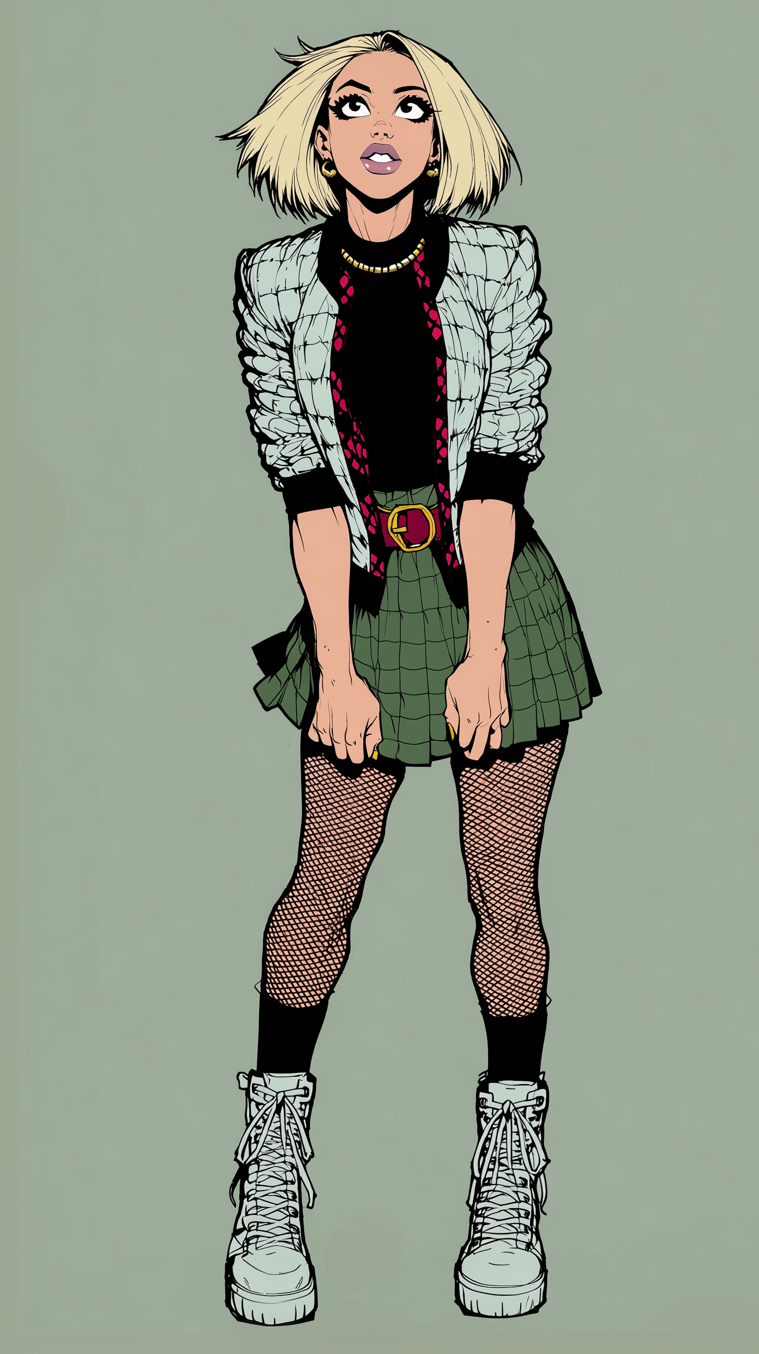 Stylized illustration of a fashionable young woman in a trendy outfit, set against a muted green background.