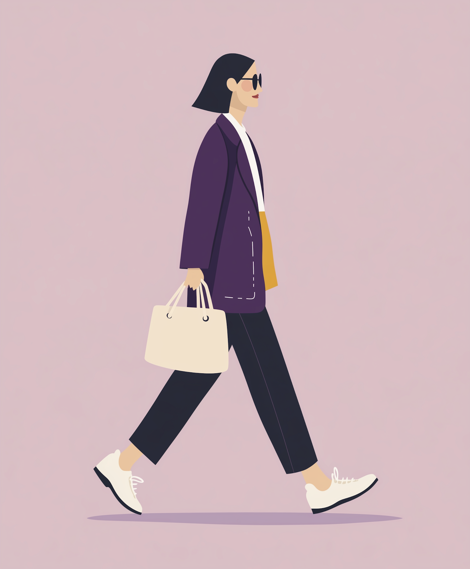 Stylish illustration of a woman in a purple coat, black pants, and white sneakers, carrying a beige handbag against a pink background.
