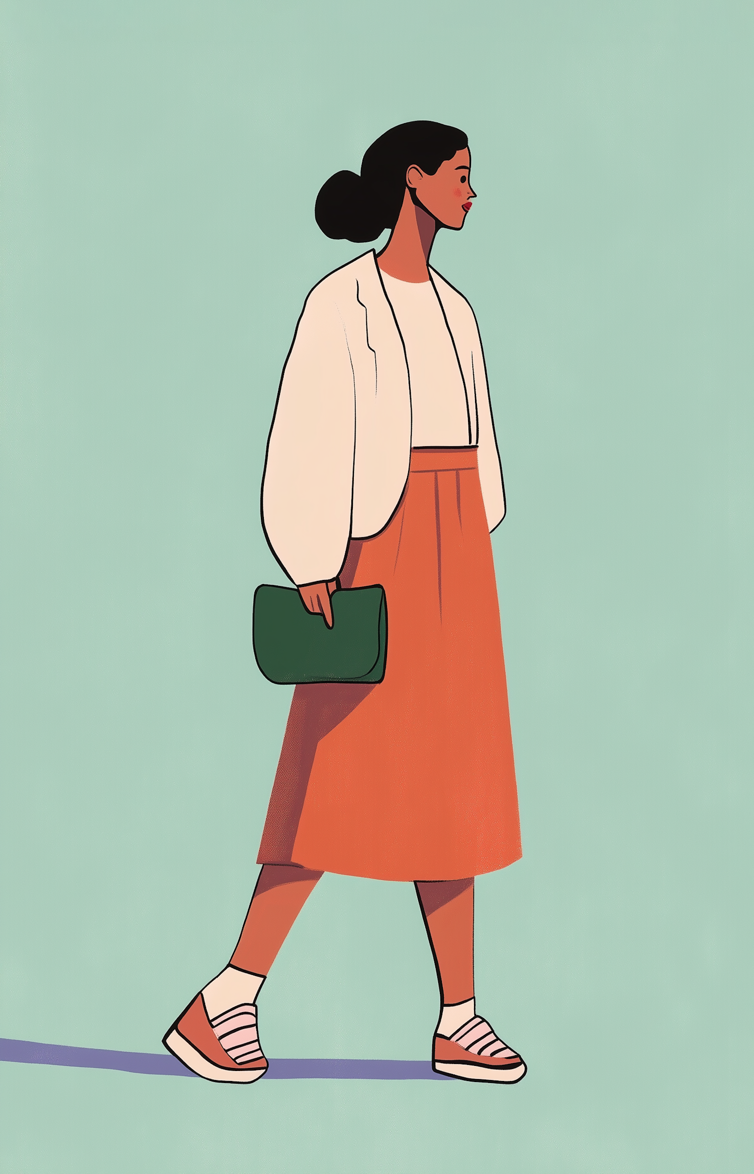 Illustration of a woman in a white blouse and orange skirt, holding a green clutch, walking confidently on a soft green background.