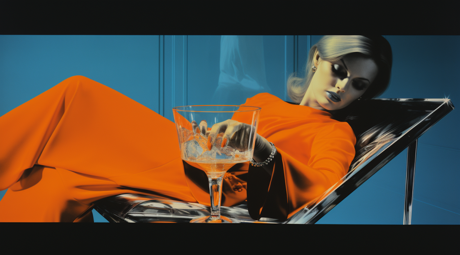 Elegant woman in orange reclines on a metallic chair, holding a glass of ice, set against a vibrant blue background.