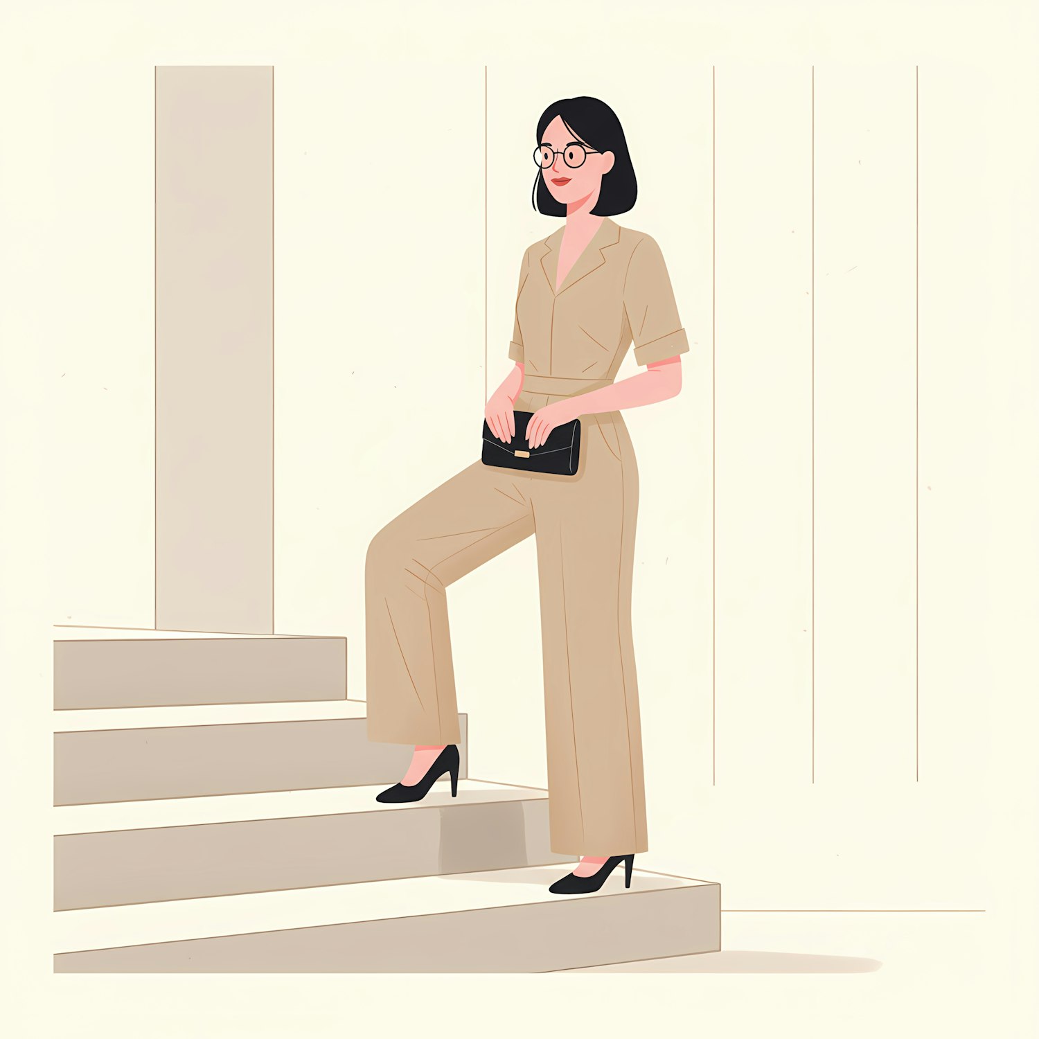 Illustration of a stylish woman in a beige jumpsuit and black heels, holding a clutch, standing on stairs in a minimalist setting.