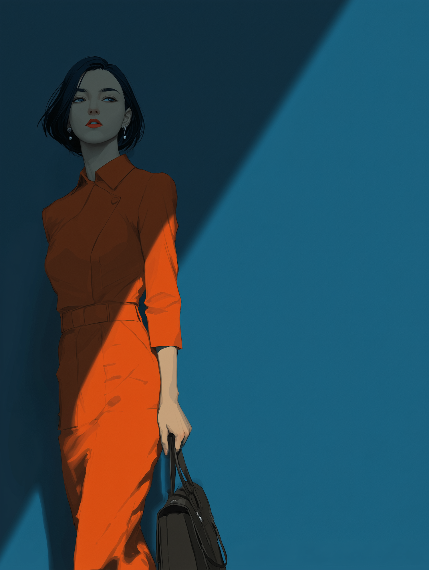 Elegant illustration of a woman in an orange dress, holding a black bag, with dramatic lighting against a teal background.