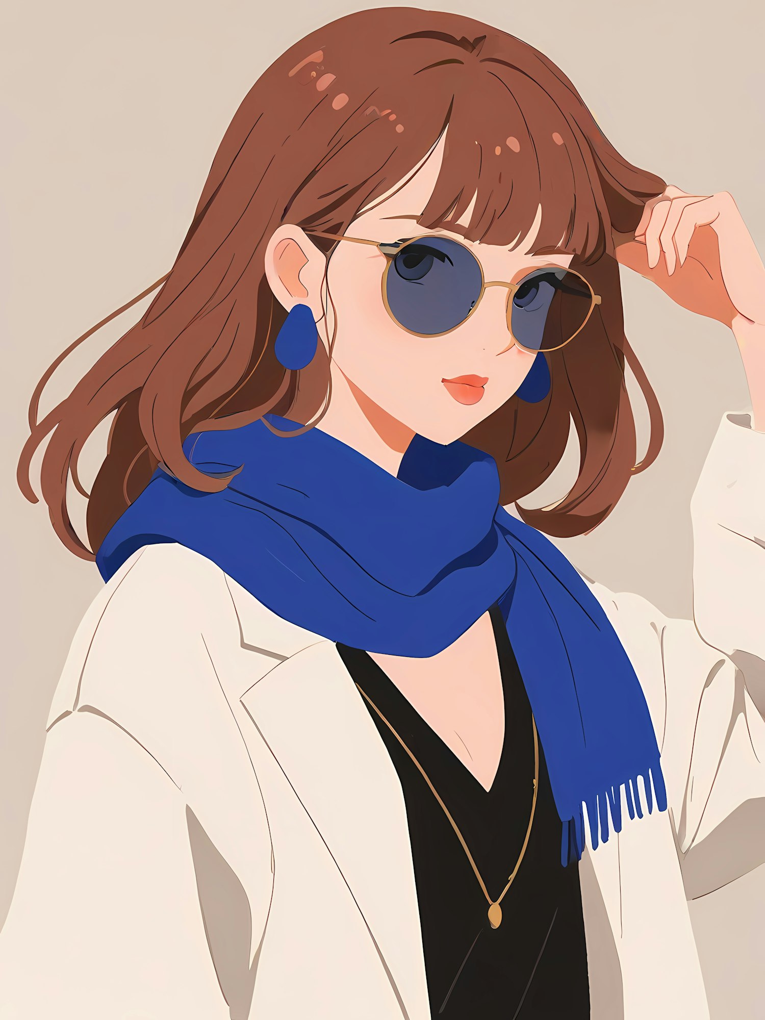Stylish illustration of a woman in sunglasses, white blazer, and blue scarf, exuding confidence and elegance.