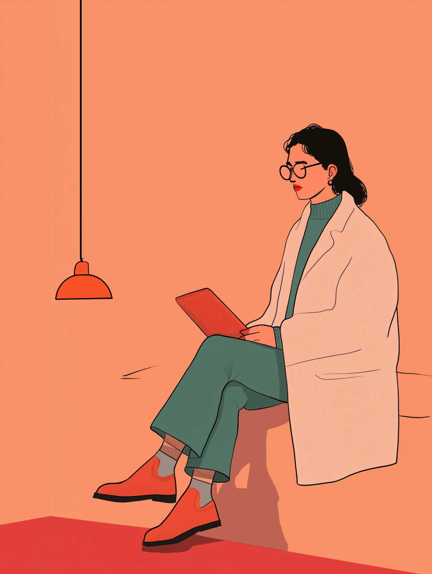 Minimalist illustration of a woman reading, wearing a white coat and orange shoes, set against a peach background with a hanging lamp.