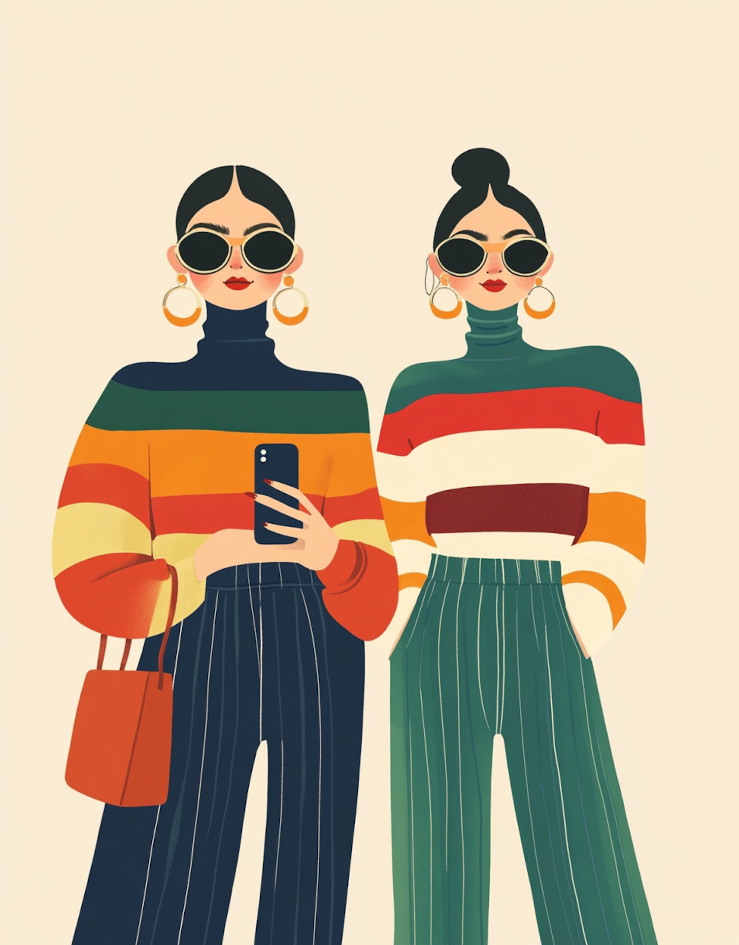 Stylish illustration of two women in colorful striped sweaters, pinstriped trousers, and bold accessories, exuding modern fashion vibes.