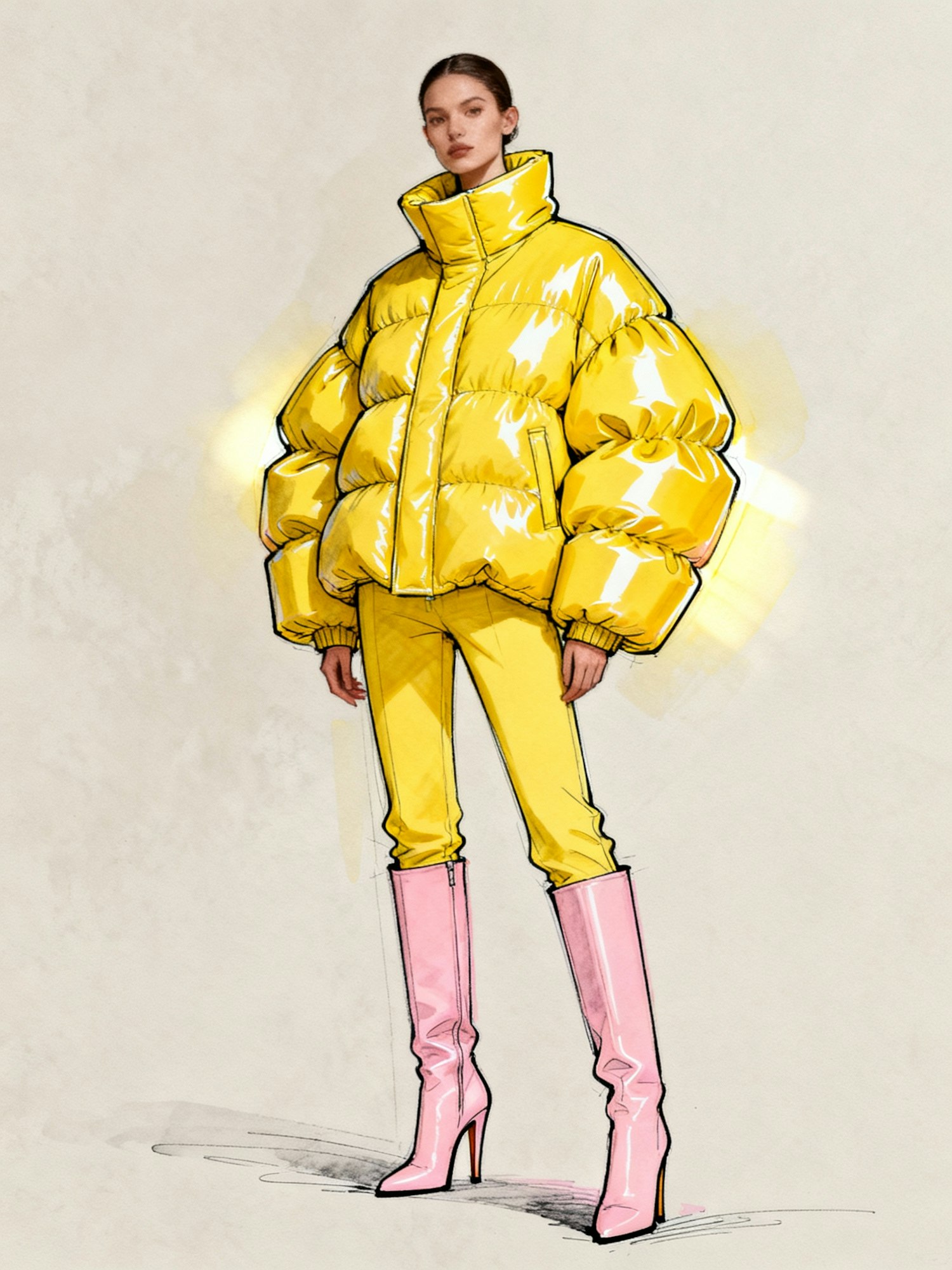 Fashion illustration of a person in a yellow puffer jacket, matching pants, and pink boots, showcasing bold and modern style.
