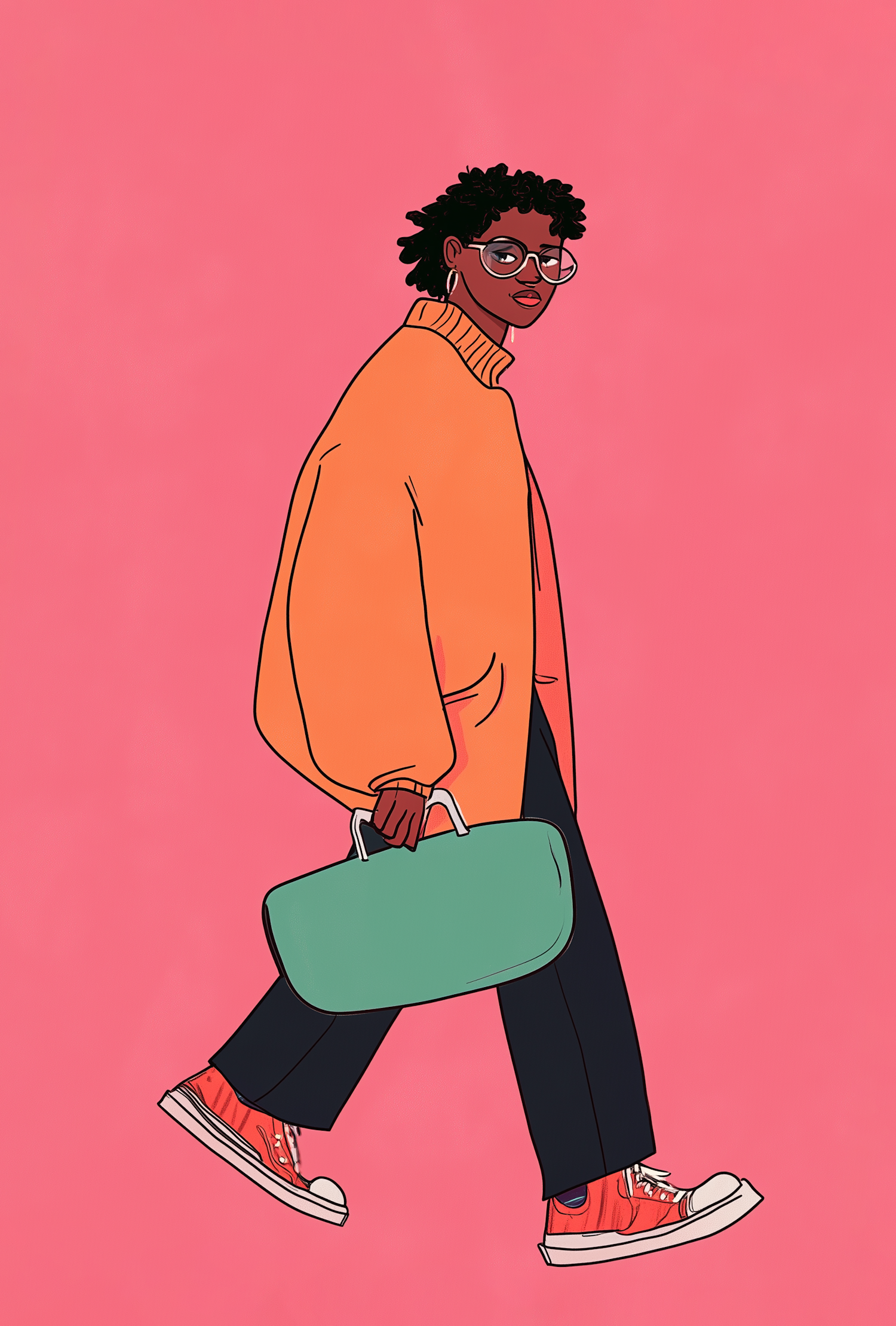 Stylish illustration of a person in an orange sweater, red sneakers, and green bag against a pink background.