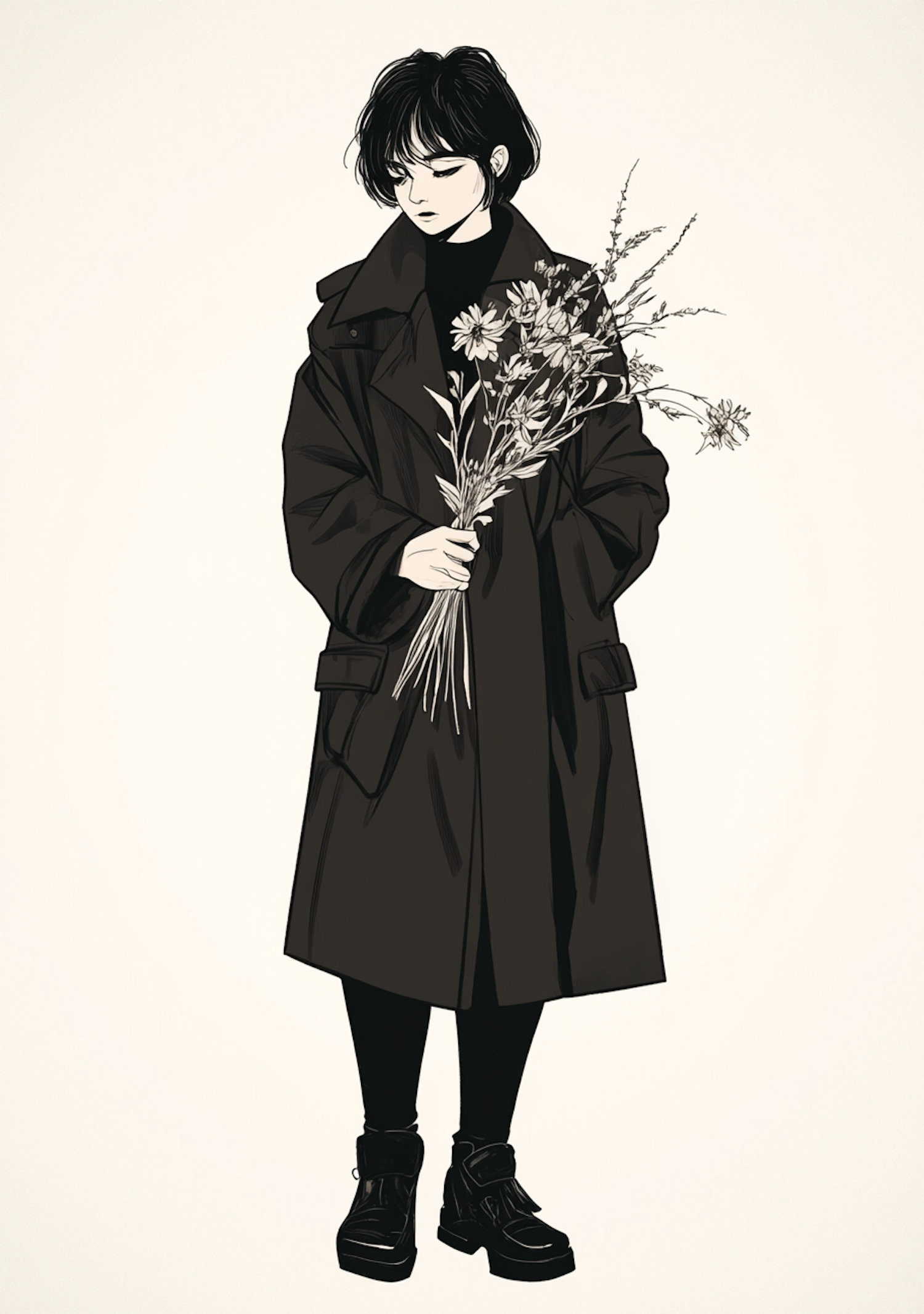 Monochrome illustration of a woman in a long coat holding wildflowers, exuding a serene and introspective mood.
