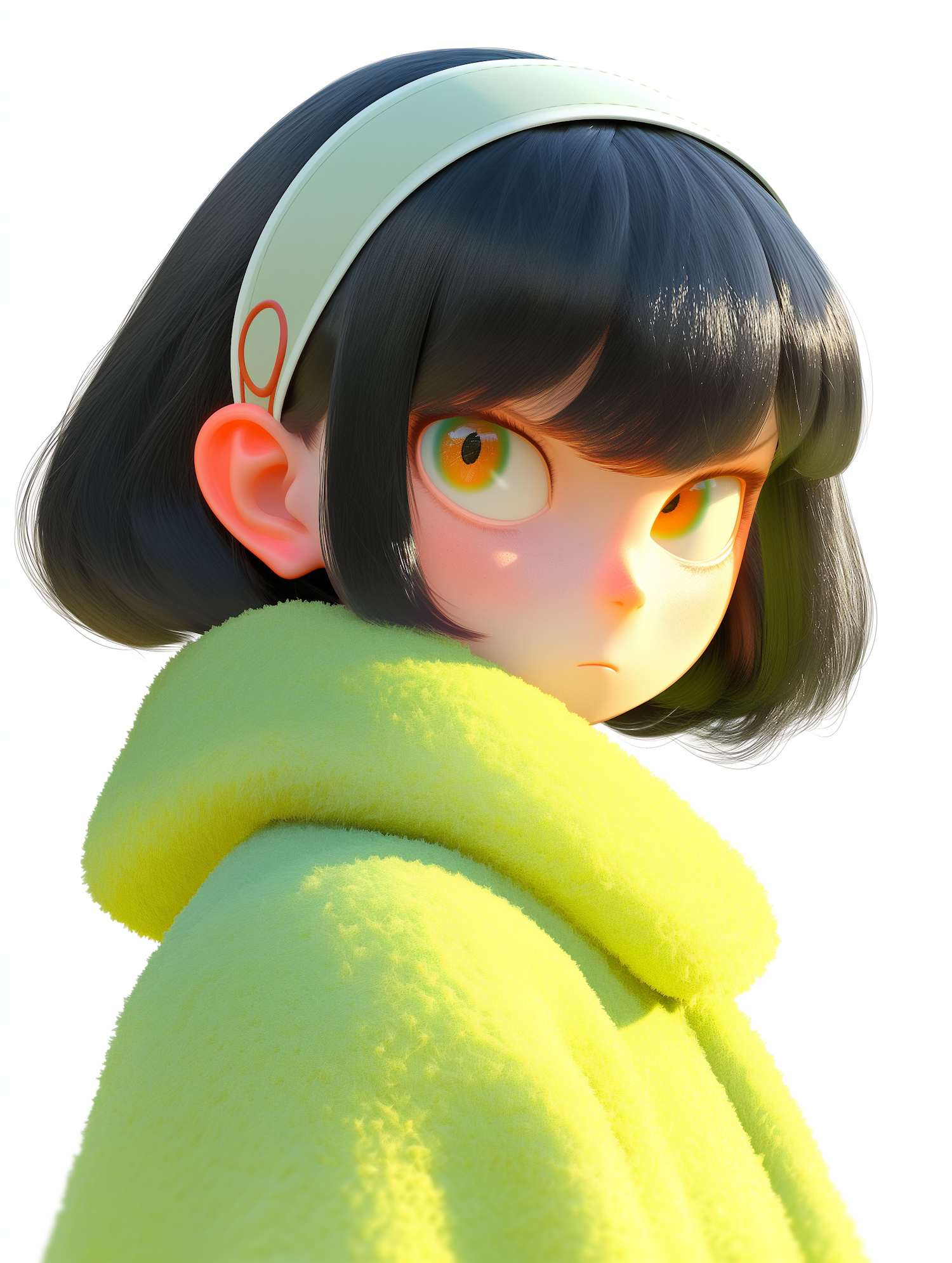 A vibrant 3D-rendered character with expressive eyes, short black hair, and a bright yellow coat, set against a clean background.